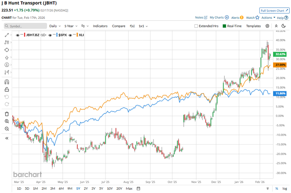 With a market cap of $21.3 billion, J.B. Hunt Transport Services, Inc. (JBHT) is a transportation and logistics provider offering surface transportation, delivery, and supply chain solutions across the country. It operates through five segments: Intermodal; Dedicated Contract Services; Integrated Capacity Solutions; Final Mile Services; and Truckload, supported by a large, diverse fleet and logistics network serving a wide range of industries. Shares of the Lowell, Arkansas-based company have exceeded the broader market over the past 52 weeks. JBHT stock has increased 31.5% over this time frame, while the broader S&P 500 Index ($SPX) has returned 11.9%. Moreover, shares of the company are up 15% on a YTD basis, compared to SPX’s marginal decline. Cathie Wood Adds 210K Shares to a Rising AI Bet With Upside of 102% Is GOOG Stock a Buy Amid the Software Selloff? Broadcom Is ‘Sitting on a Sinking Iceberg.’ Why 1 Analyst Is Warning on AVGO Stock Here. Stop Missing Market Moves: Get the FREE Barchart Brief – your midday dose of stock movers, trending sectors, and actionable trade ideas, delivered right to your inbox. Sign Up Now! Focusing more closely, shares of the trucking and logistics company have also outperformed the State Street Industrial Select Sector SPDR ETF’s (XLI) 27.3% gain over the past 52 weeks. Despite reporting better-than-expected Q4 2025 EPS of $1.90 on Jan. 15, shares of JBHT fell over 1% the next day as the company reported revenue of $3.10 billion down 2% year-over-year and below Street forecasts. Investor sentiment was further pressured by demand softness across core segments, including a 3% revenue decline in Intermodal, a 7% drop in ICS load volume, and a sharp 10% revenue fall in Final Mile Services. For the fiscal year ending in December 2026, analysts expect J.B. Hunt Transport Services’ EPS to grow 16.8% year-over-year to $7.15. The company's earnings surprise history is mixed. It topped the consensus estimates in three of the last four quarters while missing on another occasion. Among the 25 analysts covering the stock, the consensus rating is a “Moderate Buy.” That’s based on 12 “Strong Buy” ratings, one “Moderate Buy,” 11 “Holds,” and one “Moderate Sell.” On Jan. 17, UBS analyst Thomas Wadewitz maintained a “Hold” rating on J.B. Hunt Transport Services with a price target of $196. As of writing, the stock is trading above the mean price target of $213.09. The Street-high price target of $240 implies a potential upside of 7.4% from the current price levels. On the date of publication, Sohini Mondal did not have (either directly or indirectly) positions in any of the securities mentioned in this article. All information and data in this article is solely for informational purposes. This article was originally published on Barchart.com