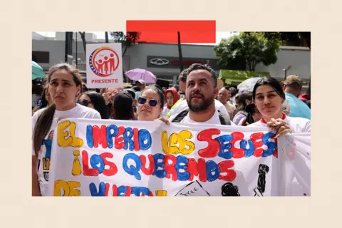 A luminous outline of Nicolás Maduro and his wife Cilia Flores loomed over Caracas against the night sky in January. The steady light of hundreds of drones in a show put on by the government in Venezuela, suspended their image in front of the clouds, before rearranging to call for their return: "El pueblo los reclama," they spelled out, "the people want them back". After a lightning operation by the US to spirit the deposed president and his wife out of the country on 3 January, Venezuela has found itself in limbo. Despite Delcy Rodríguez, the former vice president and now acting Venezuelan leader, calling for the return of Maduro and Flores, there are no signs that's going to happen. The former first couple are in New York in Brooklyn's Metropolitan Detention Center awaiting trial for alleged crimes including drug trafficking, all of which they deny. Nevertheless, Rodríguez - a Maduro loyalist - must maintain a tricky equilibrium: appealing to her socialist base by continuing to support Maduro through anti-imperialist rhetoric, while at the same time changing policies under pressure from US President Donald Trump, with the threat that she could be following Maduro if she won't comply. "Trump has implied that Venezuela is now a US protectorate, so she serves at the will of the US president," says Christopher Sabatini, senior research fellow on Latin America at Chatham House think tank. "She has also been investigated by the DEA - there's not a conviction, or bounty on her head, or indictment, but that threat has hung out there. The threat is, 'we have the goods on you'." The Drug Enforcement Administration (DEA) did not comment when approached by the BBC. Rodríguez is now walking a diplomatic tightrope. "President Maduro had already warned of an attack of this nature due to the desperation of the United States' energy voracity," Rodríguez said in her first statement after the operation. Yet shortly afterwards, Trump announced that Caracas had agreed to deliver up to 50 million barrels of oil - and that he would manage the money. And in her first speech to the National Assembly on 16 January, Rodríguez criticised "imperialist expansion by the United States". That same day, Rodríguez met with CIA Director John Ratcliffe in Caracas. Rodríguez has been contacted for comment. "Rodríguez's legitimacy lies in the military strength of the US. And it will last if Trump wants it to. She cannot stand up to him," says Carmen Beatriz Fernández, Venezuelan political analyst and CEO of DataStrategia, a political consultancy firm. One question is how long Rodríguez can keep this double act of keeping both the Venezuelan left and the US administration onside? And if she had to choose, would it be a tough choice or does one side very obviously hold the power? Caracas, Venezuela's capital city of around three million people, is festooned with banners calling for Maduro's return and decrying US interventionism. "She is handling communication in the best possible way and establishing guidelines for the country to continue moving forward despite the hijacking," Leonardo Arca, 39, a civil servant, tells the BBC during a small pro-government march in Caracas last month. These big public displays calling for Maduro's return are usually organised by the government, and it's common for people to be told to go by their bosses. He carries a banner that reads "Free Cilia". Other people carry signs that read "Yankee go home" or "Bring them back" in English. Since Maduro and Flores were detained, what feels like years of changes have been crammed into a few short weeks. The superpower of Chavismo, the left-wing political ideology that sustained the leaderships of Hugo Chavez and Maduro after him, is that it can quickly change course to keep the president - whoever that might be - in power. On assuming the presidency on a "temporary" basis, Delcy Rodríguez - a lifelong Chavista - appointed mostly technocrats rather than ideologues with a nod to the need for pragmatism as Venezuela entered a new era. Along with passing a law paving the way for US oil companies to start work in Venezuela, she also allowed for the release of numerous politicians and human rights activists who had been imprisoned for months or years. The opposition claims this has only happened because the US pressured them into it and point out that many political prisoners still remain in jail. Trump has referred to Rodríguez as "a wonderful person" and "someone we have worked very well with." Rodríguez, in turn, has acknowledged that there have been telephone calls and said that the tone is "courteous" and "mutually respectful." He has also acknowledged the diplomatic bind that Rodriguez is in. When asked by a reporter what he thought of her statements that Maduro is still the legitimate president, he dismissed it by saying: "I think she probably has to say that." Rodríguez has avoided making inflammatory remarks against Trump. But she has used language deeply rooted in Latin American communist opposition to US expansionism, referring to the US as a "lethal nuclear power", "invader" and, "imperialist". Phil Gunson, senior analyst at the International Crisis Group think tank based in Caracas, says: "Washington must understand that she must continue with this rhetoric. It is a way of maintaining cohesion in the Chavista project, even though it is known that it is not real." All experts we spoke to agree that the pressure and threat from the US on Venezuela and Rodríguez is real. "US pressure may escalate," says Ana Milagros Parra, a Venezuelan political scientist. She says options for the US could include further intervention in Venezuelan territory, more economic sanctions and further oil blockades. While Rodríguez must keep the leftist Chavismo grassroots happy, they only represent 15-20% of society and there are many Venezuelans who were never supportive of Maduro. During his 13 years in power, Maduro's popularity waned. His 2024 electi