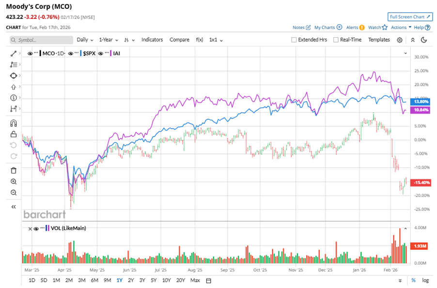 New York-based Moody's Corporation (MCO) operates as an integrated risk assessment firm. With a market cap of $76.1 billion, the company provides credit ratings and related research, data and analytical tools, quantitative credit risk measures, risk scoring software, and credit portfolio management solutions and securities pricing software and valuation models. Shares of this credit rating giant have underperformed the broader market over the past year. MCO has declined 19.1% over this time frame, while the broader S&P 500 Index ($SPX) has rallied nearly 11.9%. In 2026, MCO stock is down 17.2%, compared to the SPX’s marginal fall on a YTD basis. Cathie Wood Adds 210K Shares to a Rising AI Bet With Upside of 102% Is GOOG Stock a Buy Amid the Software Selloff? Broadcom Is ‘Sitting on a Sinking Iceberg.’ Why 1 Analyst Is Warning on AVGO Stock Here. Stop Missing Market Moves: Get the FREE Barchart Brief – your midday dose of stock movers, trending sectors, and actionable trade ideas, delivered right to your inbox. Sign Up Now! Narrowing the focus, MCO’s underperformance is also apparent compared to the iShares U.S. Broker-Dealers & Securities Exchanges ETF (IAI). The exchange-traded fund has gained about 6.5% over the past year. Moreover, the ETF’s 5.6% dip on a YTD basis outshines the stock’s double-digit losses over the same time frame. Today, on Feb. 18, MCO reported its Q4 results. Its revenue stood at $1.9 billion, up 13% year over year. The company’s adjusted EPS grew 38.9% from the year-ago quarter to $3.64. For fiscal 2025, ended in December, analysts expect MCO’s EPS to grow 18.5% to $14.78 on a diluted basis. The company’s earnings surprise history is impressive. It beat the consensus estimate in each of the last four quarters. Among the 24 analysts covering MCO stock, the consensus is a “Moderate Buy.” That’s based on 16 “Strong Buy” ratings, one “Moderate Buy,” and seven “Holds.” This configuration is more bullish than a month ago, with 15 analysts suggesting a “Strong Buy.” On Feb. 10, RBC Capital analyst Ashish Sabadra maintained a “Buy” rating on MCO and set a price target of $610, implying a potential upside of 44.1% from current levels. The mean price target of $573.30 represents a 35.5% premium to MCO’s current price levels. The Street-high price target of $660 suggests an ambitious upside potential of 55.9%. On the date of publication, Neha Panjwani did not have (either directly or indirectly) positions in any of the securities mentioned in this article. All information and data in this article is solely for informational purposes. This article was originally published on Barchart.com