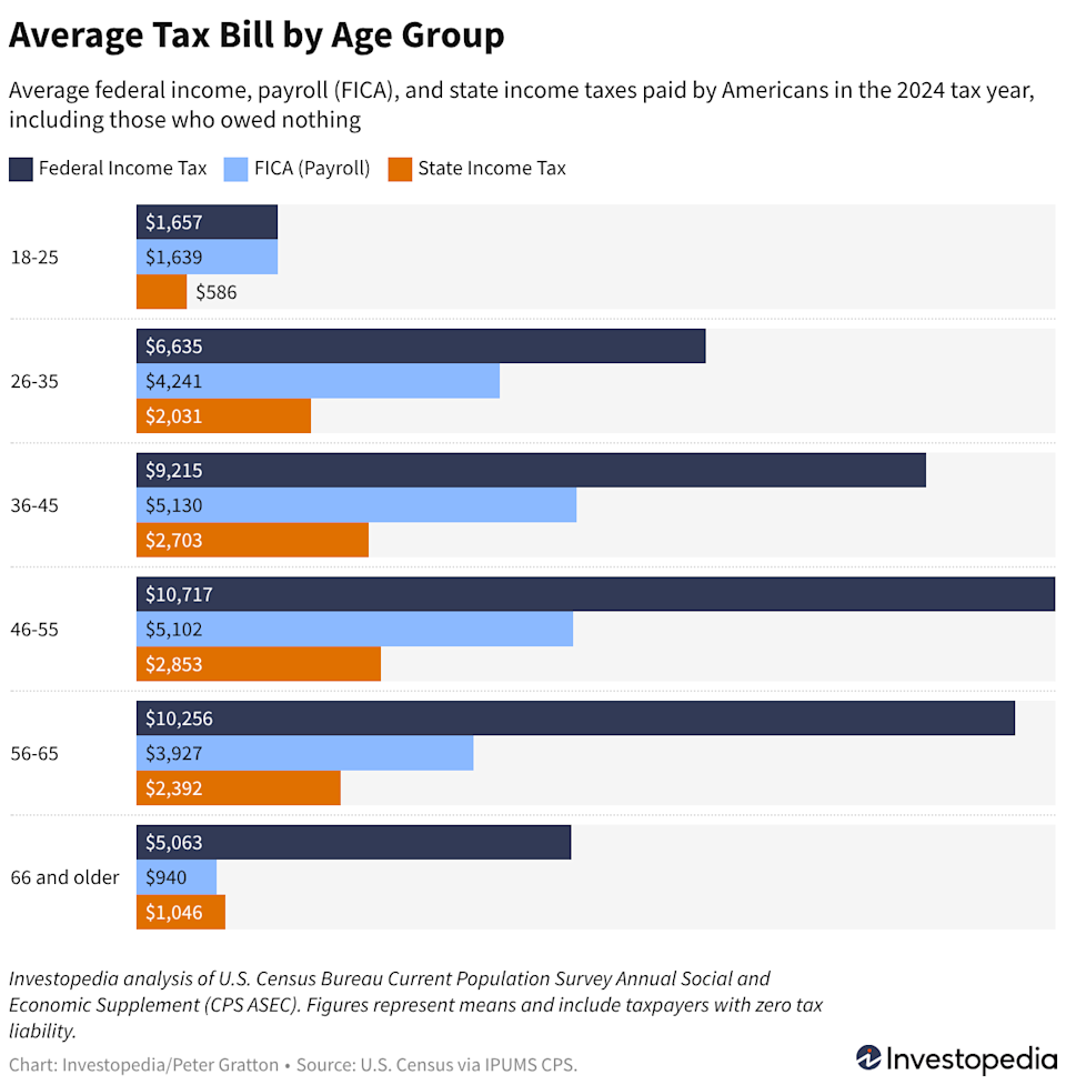 Investopedia / Photo Composite by Elizabeth Guevara / Getty Images For 2024, the average taxpayer paid almost $12,600 in federal and state income and payroll taxes. Taxpayers ages 46 to 55 typically owe the highest amount to the IRS. The One Big, Beautiful Bill Act is expected to lower the average tax bill by more than $600. For the 2024 tax year, the average taxpayer paid about $12,582 in total federal and state income taxes, according to an Investopedia analysis of the most recent Census Bureau data. The good news: that figure is expected to drop as Americans file their 2025 returns this year. The average American pays most of their income taxes to the federal government, about $7,250 for the 2024 tax year. The average taxpayer also paid about $3,412 in FICA (payroll) taxes and about $1,920 in state income taxes. Taxpayers ages 46 to 55 had the highest average tax bill, about $18,672. The federal figure is a mean that includes the roughly 40% of households that owe no federal income tax, according to a Tax Policy Center analysis. Most of them are lower-income earners. Among those who paid taxes last year, the average federal bill for 2024 was more than $24,000 for federal and state income taxes and FICA, Investopedia's analysis shows. Unlike federal income taxes, FICA taxes apply to most workers' paychecks. For lower-income earners, payroll taxes often represent the largest federal tax they pay. Tax bills vary widely depending on your age and income, and, for many Americans, the total of federal, state, and payroll taxes runs well into five figures. Knowing where you stand relative to others your age can help you plan ahead and avoid surprises at filing time. The One Big, Beautiful Bill Act made more than 100 changes to the tax code that will impact 2025 tax filings, including new and expanded tax credits and deductions that should decrease the taxes Americans pay this year. A recent analysis by the Tax Foundation shows that tax changes will cut the average taxpayer's tax bill by about $611 when they file this year. Taxpayers in middle- and upper-income groups will see the largest tax cuts relative to their income. Early data from the 2026 filing season shows tax refunds are running 10.9% higher than at the same point last year, the IRS reports. Data drawn from the U.S. Census Bureau's Current Population Survey Annual Social and Economic Supplement (CPS ASEC) tax model, via IPUMS CPS ASEC microdata, which simulates federal income, state income, and FICA tax liability for each respondent. That allows for estimates of 2024 tax liability, which is more current than the IRS's own tax-year microdata, which is only up to 2022. Read the original article on Investopedia