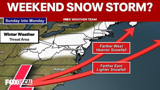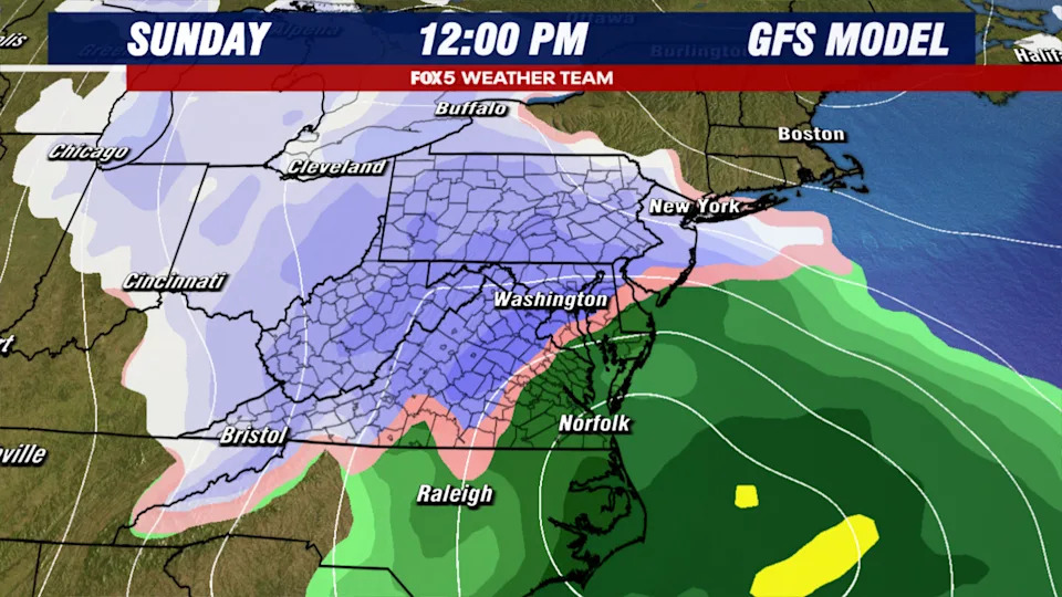 The Brief Weather models continue to debate the strength and position of a weekend storm system. The most likely scenario involves rain on Sunday morning changing to mix and then wet snow by Sunday night. The threat for accumulation has come up over the last 24 hours, with most models suggesting anywhere from 1-5" of snowfall in the D.C. region. Some extreme solutions suggest 6" or more could be possible. The threat WASHINGTON - Compared to the previous several weeks in the D.C. region, this past week has not been so bad. Sure, it has been rather cloudy and chilly, but temperatures have been consistently above freezing, allowing the region to slowly but steadily free itself from the so-called "snowcrete" that has blanketed the D.C. area for the better part of a month now. Temperatures are expected to remain above freezing into the upcoming weekend, with the best day of the entire week potentially being Saturday, with partial sunshine and middle 50s expected in the afternoon. By Saturday night, the pattern does start to shift though, as a strong dip in the jetstream sends temperatures falling back into the 30s overnight Saturday into Sunday. At the same time, a storm system is forecast to develop ahead of this cold push, which could bring a wide range of precipitation to the D.C. region, including the threat for accumulating snowfall. The big snow debate The big question of course, is how much snow? It’s a question that remains relatively difficult to answer even with just a couple days to go ahead of the potential storm system. The key to any potential storm system is its track, and its intensity. These are two features that weather models have continued to struggle with. Our general thoughts in the weather department this evening lead a little closer to the European model. With temperatures well above freezing at onset, the system would likely start as a predominantly rainfall event through the front part of the day on Sunday. Then, as a surface storm pushes eastward into the Atlantic, colder air fills in as the storm pulls away, along a weather feature known as an inverted surface trough. This would bring the risk for rain to change over to mix and a perhaps a period of potentially heavy, wet snowfall on Sunday night. Now, the tricky part of the forecast with an inverted trough situation is the area that gets accumulating snowfall tends to be in a relatively narrow band that follows the trough axis, so not everyone in the region would be looking as a decent snowfall, it would be localized in this banding. Forecasting exactly where it would setup is very difficult, and we would not have a good idea of where this feature sets up until likely closer to Saturday evening. If this solution, which the European Model has been hinting at for the last couple of days, is the correct solution, then parts of our region could see a 1-3" with an upside risk of 3-6" snowfall potential by the time the storm exits late Sunday night into early Monday morning. On the other hand, you have the American model solution, which for the better part of a day now has suggested the storm could be much more impactful. With a stronger tilt in the jetstream, the weather model suggest that a more intense storm system will develop that stays much closer to the coastline. While it also starts as rainfall on Sunday morning, the intensifying surface low pulls cold air quickly into the storm, dropping temperatures in the DC region and changing rainfall over to a widespread heavy snowfall. The model is aggressive with a heavy, impactful snowfall for everyone, with final snow totals in the double digits. Now, most forecasters agree this evening that this solution is rather extreme and unlikely to be the case with this storm. While we cannot rule it out of the realm of possibility, it is generally on its own, with most other guidance as of Thursday night suggesting lesser snowfall totals are more likely. So, if we do not believe the American model solution, what is the debate this evening? The issue lies in model consistency. Weather models have admittedly been extremely poor with the forecast solutions for the Sunday storm system. Even the European, which does have a history of being more accurate than the American model, has been extremely "jumpy" with this storm system. Sometimes jumping the system east, showing less snowfall, then bringing the storm back west, showing more snowfall. Forecasters look for run-to-run consistency, and so far we really have not seen that from any weather model just yet. The reason why has everything to do with the pattern. It is not just one piece of atmospheric energy helping steer this storm system, but multiple. The more pieces you have involved with a developing storm system, the more prone you are to errors in the forecast. This is why we might not have a truly good hold on what this system could do in the DC region until closer to Friday night or even Saturday, when the energy pieces involved in the formation of this storm system are all well sampled and better analyzed. What to be prepared for This one is going to come down to the wire in terms of figuring out snowfall amounts. What I can guarantee is this will not be a repeat of the late January storm. Temperatures will not be as cold, even after the system — no "snowcrete" this time around. This would also be wet snow, and we would likely lose some to ground melt in areas no longer covered in snow from the January system, as temperatures have been above freezing much of this week. A key thing we want to mention: A lot of people are saying, "but it is too warm to snow on Sunday! The Weather App says it will be in the 40s!" While yes, this is too warm to snow at onset...remember that your weather app is giving you the high temperature for the day. Through a process known as dynamic cooling, temperatures can cool as you bring in cooler air on the back side of a storm system, due to the upper-level trough swinging through. So, temperat