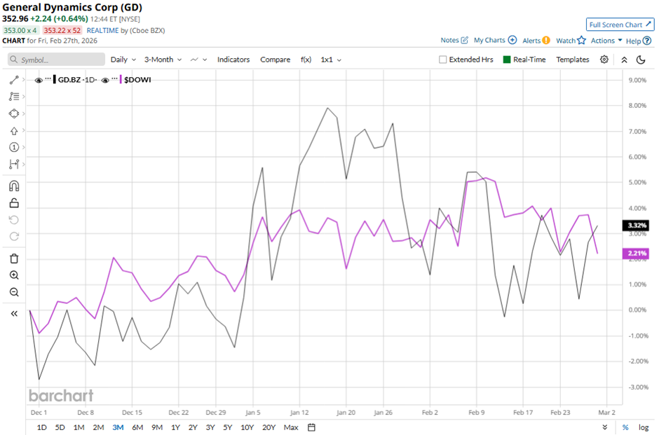 With a market cap of $94.8 billion, General Dynamics Corporation (GD) is a global aerospace and defense company that delivers advanced products and services across air, land, sea, space, and cyber domains. It operates through four segments: Aerospace, Marine Systems, Combat Systems, and Technologies, serving military, government, and commercial customers worldwide. Companies valued at $10 billion or more are generally classified as “large-cap” stocks, and General Dynamics fits this criterion perfectly. The company is known for producing business jets, building nuclear-powered submarines and naval ships, manufacturing land combat vehicles and weapons systems, and providing cutting-edge IT, cybersecurity, and mission-support solutions. ‘This is Not Business as Usual. This is Risk’: Michael Burry Warns Nvidia Looks Strikingly Similar to Cisco Just Prior to Dot Com Bubble Crash Tesla Stock Forecast: Is TSLA Headed to $25 Or $600 in 2026? Nvidia's Massive Free Cash Flow Margins Could Push NVDA Stock 45% Higher Get exclusive insights with the FREE Barchart Brief newsletter. Subscribe now for quick, incisive midday market analysis you won't find anywhere else. Shares of the Reston, Virginia-based company have slipped 4.7% from its 52-week high of $369.70. The stock has increased 3.6% over the past three months, slightly outpacing the Dow Jones Industrials Average's ($DOWI) 3.2% gain over the same time frame. GD stock is up 4.7% on a YTD basis, outperforming DOWI’s 1.8% rise. Moreover, longer term, shares of the company have surged 40% over the past 52 weeks, compared to DOWI’s 13.1% return over the same time frame. The stock has been trading above its 50-day moving average since last year. Shares of General Dynamics fell 2.7% on Jan. 28 because the company forecast 2026 annual profit of $16.10 per share - $16.20 per share, well below analysts’ expectations, despite beating Q4 2025 earnings and revenue estimates. Investor sentiment was further pressured after management disclosed that U.S. tariffs are expected to have a larger financial impact in 2026 than the $41 million incurred in 2025. The cautious outlook overshadowed solid quarterly performance, including adjusted EPS of $4.17 and revenue of $14.38 billion. In contrast, rival RTX Corporation (RTX) has outpaced AT&T stock. VZ stock has soared 8.8% on a YTD basis and 52.9% over the past 52 weeks. Despite GD stock’s outperformance relative to the Dow, analysts remain cautiously optimistic about its prospects. The stock has a consensus rating of “Moderate Buy” from 23 analysts in coverage, and the mean price target of $393.30 is a premium of 11.2% to current levels. On the date of publication, Sohini Mondal did not have (either directly or indirectly) positions in any of the securities mentioned in this article. All information and data in this article is solely for informational purposes. This article was originally published on Barchart.com