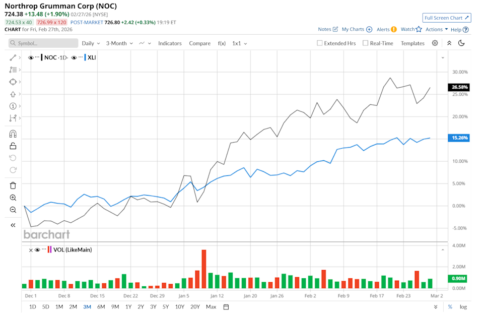 Falls Church, Virginia-based Northrop Grumman Corporation (NOC) is an aerospace and defense technology company with a market cap of $102.8 billion. It provides products such as stealth aircraft, autonomous systems, missile defense solutions, radar and cybersecurity technologies, and space satellites and launch systems. Companies valued at $10 billion or more are typically classified as “large-cap stocks,” and NOC fits the label perfectly, with its market cap exceeding this threshold, underscoring its size, influence, and dominance within the aerospace & defense industry. The company is heavily investing in Digital Engineering, which has allowed it to design and test new systems in virtual environments before physical prototyping. Citi Analysts Like This 1 ‘Picks-and-Shovels’ AI Stock. Should You Buy It Here? Nvidia Stock May Be Oversold - What is the Best NVDA Play? Analysts Think Okta Stock Can Gain 100% in 2026. Should You Buy the Dip? Stop Missing Market Moves: Get the FREE Barchart Brief – your midday dose of stock movers, trending sectors, and actionable trade ideas, delivered right to your inbox. Sign Up Now! This aerospace and defense giant is currently trading 2.8% below its 52-week high of $745.55, reached on Feb. 19. Shares of NOC have surged 27.7% over the past three months, outperforming the State Street Industrial Select Sector SPDR ETF’s (XLI) 15.9% uptick during the same time frame. Moreover, on a YTD basis, shares of NOC are up 27%, compared to XLI’s 14.2% rise. In the longer term, NOC has soared 57.5% over the past 52 weeks, outpacing XLI’s 31.7% gain over the same time frame. To confirm its bullish trend, NOC has been trading above its 200-day moving average since mid-June, with slight fluctuations, and has remained above its 50-day moving average since mid-December. On Jan. 27, shares of NOC rose 2.7% after the company reported better-than-expected fourth-quarter results. Driven by solid revenue growth across all reporting segments, its net sales climbed 9.6% year over year to $11.7 billion, slightly exceeding consensus estimates. Additionally, supported by strong operating income growth in its aeronautics, mission, and space systems divisions, adjusted EPS came in at $7.23, up 13.1% compared to the prior-year quarter and 3.3% above analyst forecasts. NOC has outperformed its rival, Lockheed Martin Corporation (LMT), which surged 47.4% over the past 52 weeks. However, it has lagged behind LMT’s 36.1% rise on a YTD basis. Looking at NOC’s recent outperformance, analysts remain moderately optimistic about its prospects. The stock has a consensus rating of "Moderate Buy” from the 22 analysts covering it, and the mean price target of $741.80 suggests a 2.4% premium to its current price levels. On the date of publication, Neharika Jain did not have (either directly or indirectly) positions in any of the securities mentioned in this article. All information and data in this article is solely for informational purposes. This article was originally published on Barchart.com