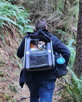 Promising review: "I LOVE this pet backpack!! I have a maltipoo (who is my lovely little fur baby), and she likes to go with me everywhere. Now I can take her hiking on trails with me! 😊 The backpack is so roomy but not bulky, a win! There are two small zipped side pockets, perfect for two water bottles. There is a harness buckle, so your little one doesn’t fall out. I walked with the flap open so she could stand, sit, and be nosey. She was perfectly safe the entire 3-mile hike." —The busiest woman you know
