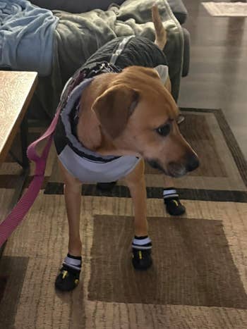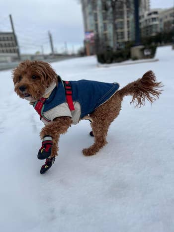 "Get ready for your dog to react really awkwardly when they’re on. At least my dog stiffened and would stand frozen in one place every time I put them on him. The key was having treats a few steps away to make him move and gain confidence. Once he got moving, he’d run freely through the snow.