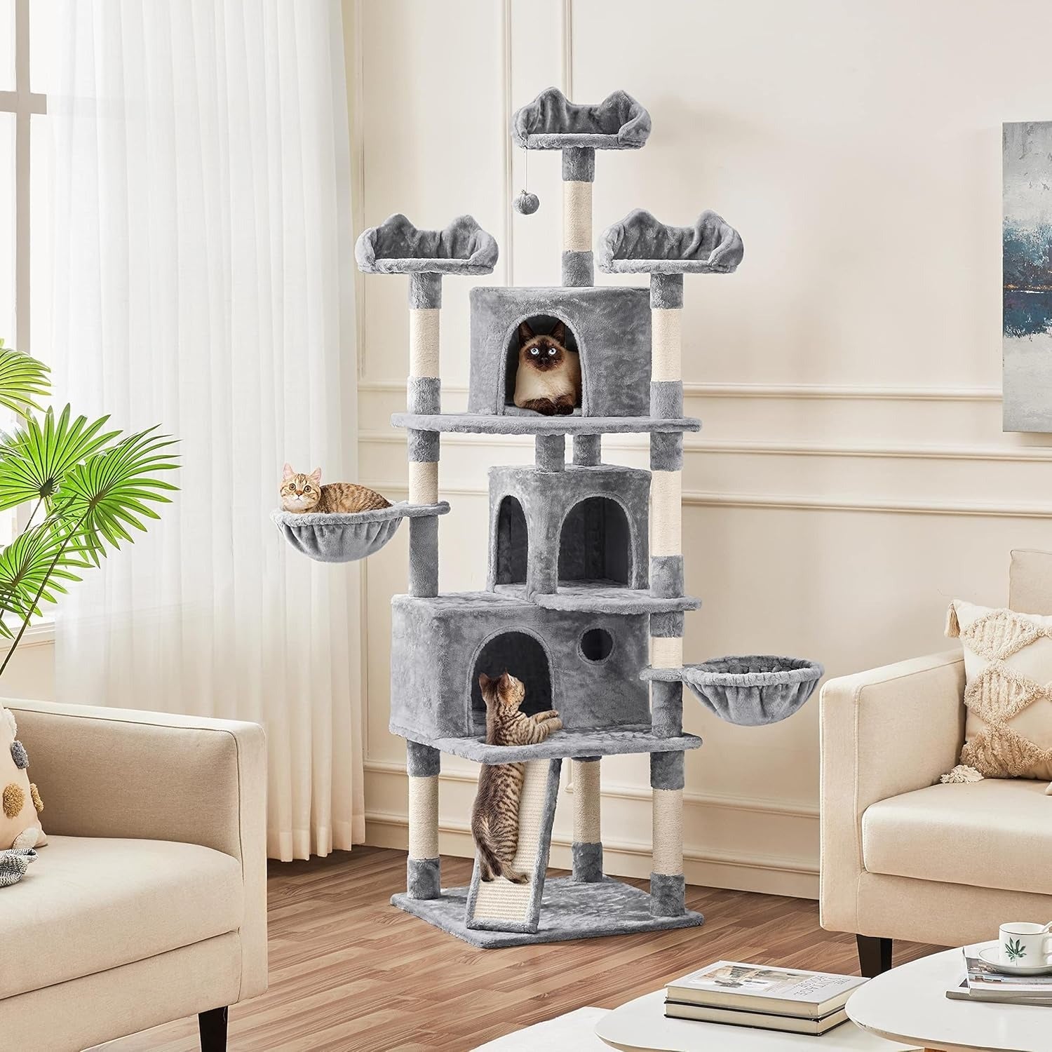 We hope you love our recommendations! While every product is independently chosen by our editors, BuzzFeed and our publishing partners may collect a share of sales or other compensation from the links on this page. You can read more about how our affiliate partnerships work in our Editorial Standards & Ethics Guide. “This isn’t just about fun and games; it’s deeply rooted in their biology," said our expert. This love of high spaces is part of cats’ natural instincts, according to Stephanie Merlin, a certified feline behaviorist and cat well-being educator who runs the popular Instagram account @thefulfilledfeline. “Cats are both predator and prey, so having a high vantage point is a natural way to help them feel safe and secure,” Merlin wrote. “This isn’t just about fun and games; it’s deeply rooted in their biology.” One way to support your cat’s evolutionary need for heights is through investing in a cat tree, a dedicated structure with multiple tiers for cats to climb and perch on. The benefits of cat trees “go way beyond offering vertical space,” Merlin explained. “Many include scratching surfaces, cozy beds, hidden nooks and plenty of spots to leap and explore. Read on for Merlin’s recommendations on how to choose the best cat tree for your pet, including one of her favorite models and more cat trees selected by us. Certified feline behaviorist and educator Stephanie Merlin named this Archie & Oscar Fiedler cat tree as one of her favorites. "When choosing a cat tree, focus on size, function, and accessibility," Merlin wrote. Crucially, "many cat trees on the market are designed more for kittens than adult cats. While smaller trees can be fun, having at least one larger tree (5 feet or taller) is ideal," she explained. This model stretches 73 inches tall, or just over six feet, at its highest point. With multiple tiers for exploring and napping, two enclosed nooks and six dedicated scratching posts, the structure is a great option for single and multi-cat households. It also includes a wall anchor for extra safety and stability. Get it from Wayfair for $95.99+ (originally $164.89; available in two colors). "Function is crucial, too," Merlin added. "Many trees have lounging spaces, but sometimes these aren't big enough for a full-grown cat. Check that scratching surfaces are practical and tall enough and that play features are actually engaging.” I own this Yaheetech cat tree (or rather, my cat Bee does). Bee clearly adores this model She lounges happily on each of its levels, which provide plenty of space for her adult size, and switches between the many scratching posts on the tree for her clawing fix. She loves sleeping in the top bed and frequently cozies up inside the enclosed cave for a nap or some extra privacy as she peeks out to eye (judge) whatever I'm doing. This tree is also plenty sturdy; the structure doesn't wobble despite not being mounted to my wall (though the structure does include a built-in mounting option), and I don't feel any anxiety about it tipping. This option is 63 inches at its highest point and comes in seven colors (including a sweet pink and an edgy black). I own the dark grey, which in person is more of a slate blue. Get it from Amazon for $49.99+ (available in two sizes). Merlin recommended considering your cat's specific accessibility needs when choosing a cat tree. For example, "A senior cat benefits from vertical space too, but you'll want to find a tree with lower steps or platforms that are easier to reach," she said. We think this Lima Pet cat tree from Wayfair provides features that your senior cat may appreciate, like a handy ramp and close-together tiers for an easier ascent. The ramp also doubles as a scratching surface! The structure is covered in a cozy, plush material and sports multiple hanging beds, enclosed caves, ledges and coiled rope scratching posts. The cat tree measures 68 inches at its highest point and comes in five colors (including a fun on-theme leopard print); the model also features a large baseboard to help prevent wobbling. Promising review: "This cat tree was the best money ever spent. I did much research because many other cat tree reviews said the house part was too small for their large cats. This one did not disappoint. The tree has two houses that have more than enough room for our two 15 pound cats. They absolutely love it, and pretty much live on it. The are super happy and content. In addition the tree has scratching posts that I thought they wouldn’t make use out of, but it turns out they love to dig in, and it definitely aids in trimming their nails. This cat tree by far was the best one I found in my research, and I would highly recommend it. Your kitties will be very happy. One more thing .. other tree give you instructions to secure it to a wall. This one does not need. It is very secure and steady on its own." —Albert Get it from Wayfair for $135.99+ (originally $499.96). Cats will love scaling up and down this 68-inch tall Allewie cat tree, and especially settling down for a nap or some eagle-eyed surveillance in the model’s ample lounging spots. Kitties will have their pick of the structure's trio of ultra-high beds, the two sweetly pocketed hanging beds and two roomy caves, plus the structure’s regular tiered perches. Ideal for multi-cat households or an especially lucky single cat, the tree is also covered in sisal rope that kitty claws will love digging into. You can grab this option in six colors. Promising review: "This is definitely the best cat tower I’ve bought. I will say that the box itself when delivered was super heavy due to the great quality so you may need help. I love the quality so much, especially for the price it’s definitely worth the money. My 4 cats were immediately obsessed. My favorite part is the size of everything. The baskets are nice and big so even my pudgy cat fits in comfortably. The open square beds are also big and the plush des