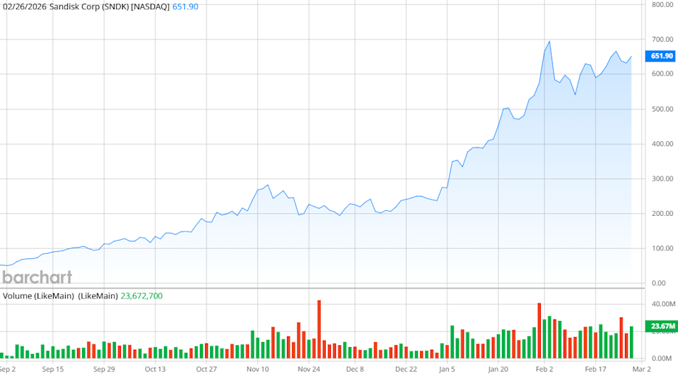 It has been a great 12 months for Sandisk (SNDK) and its investors. SNDK stock is up more than 1,100% in the past 52 weeks on strong optimism that the company’s NAND flash storage products and other computing memory devices will continue to be in high demand. Sandisk was the best-performing stock in all of the S&P 500 ($SPX) in 2025, and is continuing its strong performance with a 150% year-to-date (YTD) gain. But a short report from Citron Research threatens to let some air out of Sandisk’s sails. Citron said Sandisk is vulnerable because it believes that NAND flash memory drive demand is cyclical rather than structural, and the company is ripe for a pullback. Investors Are Bullish on Alphabet Stock - Piling Into GOOGL Call Options With Huge Unusual Options Volume Stock Index Futures Higher as Investors Digest U.S. ADP Jobs Report This Oil Stock Just Soared 130%. Should You Chase Battalion Oil Here? Stop Missing Market Moves: Get the FREE Barchart Brief – your midday dose of stock movers, trending sectors, and actionable trade ideas, delivered right to your inbox. Sign Up Now! "The market is pricing Sandisk like it's [Nvidia (NVDA)]," Citron said in a social media post. "There's one problem: Nvidia has a moat. Sandisk sells a commodity. We've seen this movie before [in] 2008, 2012, 2018. It's never different this time. Memory is a cycle, and cycles peak." Citron also suggests that Samsung is the better computing storage stock. “Samsung has a 30-year history of choosing market share over margins," Citron said. "They wait for pure-plays like SanDisk to get comfortable at 50% gross margins, then flip the switch." Is Citron right that Sandisk has run too high, too quickly? Sandisk has an interesting history. The company was purchased by data storage company Western Digital (WDC) in 2016. But in 2023, Western Digital announced it would spin off Sandisk again into a new company that included Sandisk’s and Western Digital’s flash products, solid-state drives (SSDs), memory cards, and USB drives. That has been a winning formula for Sandisk, which is based in Milpitas, California. With its dramatic rise in share price, the company now has a market capitalization of $83.4 billion. Its products can be used in phones, laptops, cameras, and game systems. Sandisk also has a fast-growing edge computing segment, which supplies storage for smart devices that create data, such as cameras, drones, and motor vehicles. Even with those gains in stock price, however, Sandisk is surprisingly affordable. SNDK stock’s forward price-to-earnings (P/E) ratio of 16 times compares favorably with Samsung. So, you’re paying a slight premium for Sandisk shares — but the stock’s performance over the last 12 months more than justifies the cost. Sandisk continued its winning ways when reporting earnings for the fiscal second quarter of 2026. Revenue of $3.02 billion was up 61% from a year ago and 31% on a sequential basis. Net income was $803 million, up from $104 million in the same period last year, while EPS of $6.20 was much higher than the $3.49 EPS that analysts had projected. Sandisk received most of its money from its edge computing segment, which generated $1.67 billion in revenue, up 21% sequentially. However, its data center segment grew even faster, up 64% sequentially to $440 million, while its consumer segment jumped 39% sequentially to $907 million. “This quarter’s performance underscores our agility in capitalizing on better product mix, accelerating enterprise SSD deployments, and strengthening market demand dynamics, all at a time when the critical role that our products play in powering AI and the world’s technology is being recognized,” said CEO David Goeckeler. Management issued Q3 guidance for revenue in a range from $4.4 billion to $4.8 billion, and net income per share between $12 and $14. If those projections hold, Sandisk is looking at a sequential revenue increase of 45% to 59%. Citron is certainly an outlier when it comes to Sandisk. Despite the short report, the 21 analysts covering SNDK stock are overwhelmingly bullish, with 14 “Strong Buy” ratings, one “Moderate Buy,” and six “Hold” ratings. The mean price target of $700.94 suggests a 17% potential gain from here. Meanwhile, the high target of $1,000 hints that a 67% increase could be possible, and the low $235 price target hints toward a possible 60% loss. The big swing in price targets isn’t a huge surprise, considering how quickly SNDK stock has risen in 2026 alone. However, Sandisk is certainly riding the wave of data-center spending, as it is increasingly supplying storage systems to companies that are building out AI computing capacity around the world. The Citron short report is worth noting, but for now, I’m still bullish on Sandisk. It’s a buy for me. On the date of publication, Patrick Sanders had a position in: NVDA. All information and data in this article is solely for informational purposes. This article was originally published on Barchart.com
