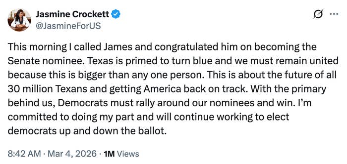 "if you honestly believe racism didn't play a part in Jasmine Crockett losing, then you're f**king idiots." Hi, I’m Michaela Bramwell, and I'm a Junior Staff Writer here at BuzzFeed, covering everything trending news, from your latest viral TikTok to the chaos of today's politics.