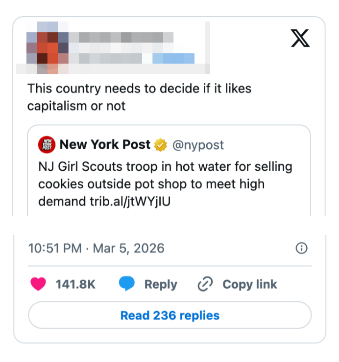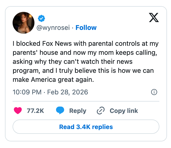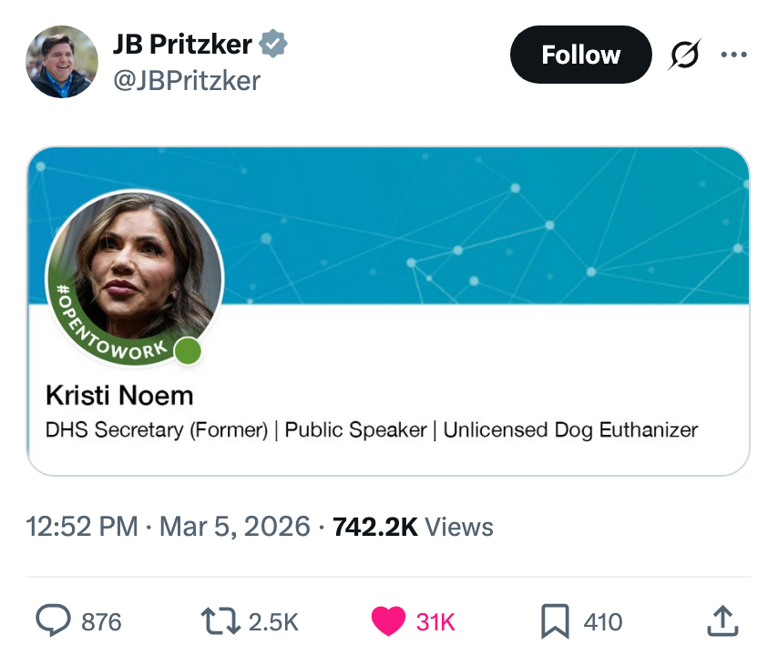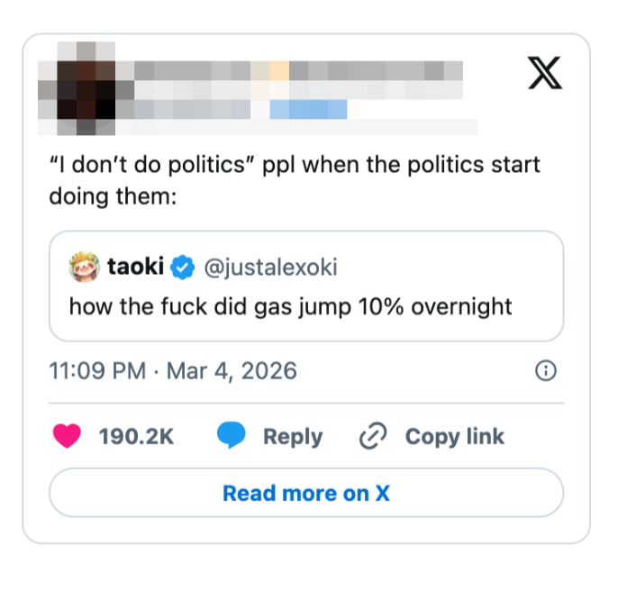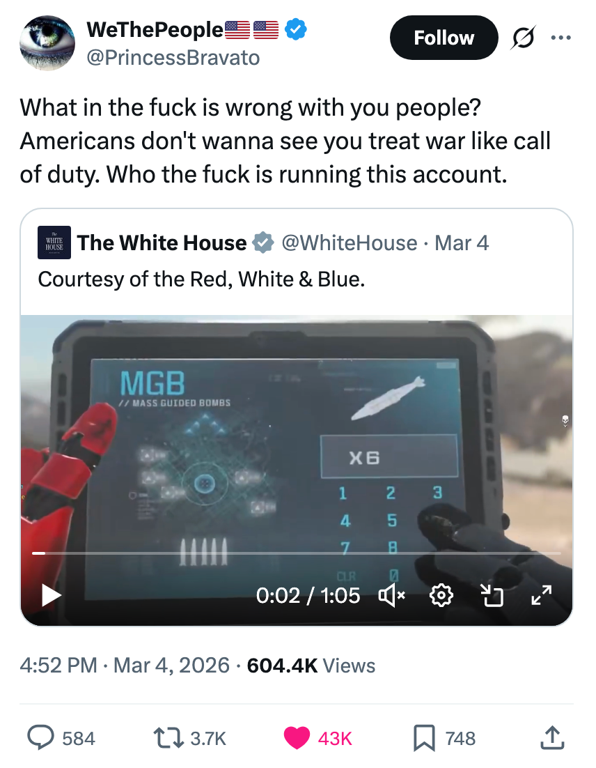 "Kash Patel is busy today praying he doesn’t get Noem’d since he needs the FBI jet to get to Coachella next month." I'm the AAPI Culture Editor here at BuzzFeed, where I cover everything from trending news to pop culture to AAPI issues. Editor's Note: While we can't endorse what X has become, we can bring you the worthwhile moments that still exist there, curated and free of the surrounding chaos. He looks alive to me. https://t.co/T0FzKy2Z3a You occasionally get a moment that symbolizes everything wrong with this country. In this case it's a U.S. Marine veteran screaming out that no one wants to fight for Israel and a U.S. Senator breaking his arm. A perfect encapsulation of US foreign policy. pic.twitter.com/FqgSvodurk This is frying me https://t.co/i0DWNMdnwe Can you imagine the Republican reaction if a woman president said she went to war because she had a “feeling” https://t.co/eJq82K1FB8 Rubio: “Iran is run by religious fanatics.”The White House right now: pic.twitter.com/zWxY3wvwAK US: “It was a preemptive attack on Iran”Pentagon: “No sign that Iran was going to attack first”US: “No but if Israel attacked Iran, then Iran would have attacked us, so we preemptively attacked them first” 🤡This is beyond satire. pic.twitter.com/Y6wRzO2CHx Holy shit, Senator Tillis just flash fried Kristi Noem over her failed leadership and FINALLY screamed at her for killing that puppy.This was BRUTAL. 🔥🔥🔥 pic.twitter.com/UtILasodt0 Lawrence O’Donnell: “The only president in history, who in the third day of a war, is talking to the world about the drapes that he chose.”Motherfucker is giving a drapery update 3 days into a war. Imagine FDR updating America on his fabric swatches during D-Day. pic.twitter.com/b1yuK7xnWW Mullin: Trump ended eight warsHunt: He started this oneMullin: This isn’t a warHunt: The Secretary of Defense, who calls himself the Secretary of War, said today, this is a war pic.twitter.com/TL5SKszXNM Note: The image in the original tweet was replaced here due to photo rights. Really seems like this is just occurring to him for the first time https://t.co/y3lkRcVBh6 I knew my teenage son was going to get into the liquor cabinet after I fell asleep and then go street racing. To prevent that, I drank all the booze myself, got into the car, and crashed it into the nearest oak tree.It was the responsible thing to do. pic.twitter.com/cgNKjd8ttB Note: The images in the original tweet were replaced here due to photo rights. Moskowitz: "Let me congratulate the former Homeland Security Secretary on her appointment to be the Shield of Americas, which I'm pretty sure the president came up with when he watched the last Avengers movie" pic.twitter.com/zapJmvuHpS Talarico: They're going to throw everything they have at us. They're going to call me a radical leftist. They're going to call me a fake Christian. They'll call our movement un-American. They'll call us a threat. The only truth is we are a threat to their corrupt system. pic.twitter.com/RZo22kR78q For more political tweets, check out our most recent roundup: "Please Restrain From Drinking Too Much As You Have Been Warned From Your Staff": 59 Political Tweets From The Last Month That Are So Brutal But So Real