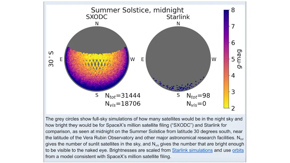 When you buy through links on our articles, Future and its syndication partners may earn a commission. SpaceX's plan to launch one million orbiting data centers to space worries astronomers,who say the satellite streaks caused by the proposed constellation would severely impair observations. Just as astronomers began to learn how to coexist with broadband megaconstellations in low Earth orbit (LEO), such as SpaceX's Starlink, a new threat has emerged, causing significant concerns. Elon Musk's envisioned constellation of one million orbital data centers would result in possibly tens of thousands of moving objects as bright as stars that are visible in the night sky at any given moment, even to the naked eye, according to astronomer and dark sky consultant John Barentine. Barentine spoke to Space.com on behalf of a group of astronomers who are raising objections against SpaceX's application to launch the constellation, which the company filed with the U.S. Federal Communications Commission (FCC) on Jan. 30. Starlink currently consists of around 10,000 satellites. Those spacecraft are visible to the naked eye only shortly after launch, because they dim as they raise their orbital altitude. The Starlinks still leave streaks in telescope images, but SpaceX has, after consultations with the astronomy community, managed to reduce the satellites' brightness by using less reflective materials and tilting reflective components like solar panels away from Earth. The brightness of newer Starlink satellites dropped to just above the limit recommended by the International Astronomical Union to prevent interference with astronomical observations. SpaceX's new data-center plan, however, threatens to thwart this progress, according to Barentine. "It really feels like it's undermining what we have achieved in the last few years, which wasn't ideal for astronomy, but was a far cry from what we feared in 2019 when the Starlink program began," he told Space.com. "We felt we were heading in the right direction that was reasonably sustainable. And this feels like a complete reversal of that." According to some estimates, each of the orbiting data centers could be up to 330 feet (100 meters) long, circling Earth at altitudes between 310 miles and 1,243 miles (500 to 2000 kilometers) pole to pole with a constant exposure to sunlight. "The other constellations that we have dealt with so far are mostly at lower altitudes and in lower-inclination orbits," Barentine said. "That means the satellites spend most of their time in Earth's shadow. We really don't see them very much in the middle of the night, or they are not that bright. But the data centers will be in high-inclination orbits and will be fully illuminated by sunlight even as seen from the ground at midnight." Barentine described the proposal as a "vastly different prospect" compared to all other existing and planned constellations. "This is a challenge unlike any we have encountered thus far in this new era of commercial space," he said. The development comes just as the astronomical world brings online some of the most powerful sky-observing machines of all time, designed to push the limits of the human understanding of the universe. These big ground-based scopes, including the $10 billion Vera Rubin Observatory, opened last year, or the $2 billion Extremely Large Telescope currently under construction in Chile, will have their observations severely obstructed by those satellites. "We could schedule our observations so that we aren't looking in the direction of the satellite when it's passing or close the shutter in front of our cameras and reopen it later on," said Barentine. "But at some point, the amount of time the shutter is closed starts degrading your observations. And I worry that, with more than a million objects, the shutter would be closed more than it would be open." In addition, Barentine and his colleagues estimate that, with the expected rate of replacement of the constellation's satellites with newer technology, one old spacecraft would be burning up in Earth's atmosphere every three minutes. This mass incineration of metal would result in a steep increase in concentrations of potentially dangerous pollutants such as aluminum oxide and lithium in the upper atmosphere, which could lead to ozone depletion and temperature changes. Currently, about three old satellites or used rocket bodies perish in the atmosphere every day. Further air pollution would come from the frequent rocket launches needed to deploy and maintain the constellation. The project would also increase the risk of space debris strikes on Earth, the astronomers say. The researchers are even more concerned about the development because the FCC put the application on a fast-track path, meaning SpaceX won't need to conduct an environmental impact assessment of the project. Barentine explained that, while in the past applicants had to prove that a development would not cause significant environmental harm, the fast-track process means it is now up to those objecting to a development to conduct those frequently time-consuming analyses to prove their case. "The presumption now is that the application should be approved and that it should be up to the people who might object to prove that there's a problem of some kind," said Barentine. "The fact that they have fast-tracked this application, which has potentially tremendous effects not only for astronomy but for the environment too, and to do so without engaging in a full environmental review, is worrisome." The objectors had only until March 6 to submit their documentation, putting further pressure on the astronomers, according to Barentine. SpaceX didn't respond to Space.com's request for comment.