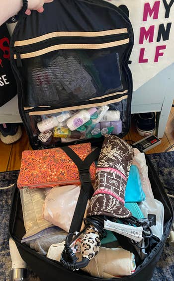 We hope you love our recommendations! While every product is independently chosen by our editors, BuzzFeed and our publishing partners may collect a share of sales or other compensation from the links on this page. You can read more about how our affiliate partnerships work in our Editorial Standards & Ethics Guide. Including a wrap top you can wear at least five different ways! Talk about making the most of what's in your carry-on. Just pack in your clothes, roll up the bag, and watch as the excess air is squeezed out. BuzzFeed Shopping writer Emma Lord says, "HELLO, I AM OBSESSED WITH THESE. Despite all the rave reviews, I was definitely skeptical of space-saving bags that didn't require a vacuum, and even as they were actively squishing my clothes into oblivion, I still couldn't quite believe it. I had easily two suitcases worth of clothes I wanted to pack for a three-week trip to London, and I managed to neatly pack the entirety of my wardrobe in one roller carry-on bag. Truly, all I had to do was put my clothes in the bag, push them to the bottom, and then sit on it to get the air out before sealing it up. I had tons of extra bags and made a habit of taking them with me in case other people joining me on trips need them to be able to pack souvenirs on the way home. I'm never taking a long trip without these again — these are worth every damn penny." Promising review: "I travel monthly for work, usually gone for 4–5 days. Before these, I would have to check a bag. Dress shirts and pants roll up nicely and stay wrinkle free. It's tempting to want to over-stuff these, but if you're packing golf shirts or clothes with 'slippery' fabric, they slide out of the top of the bag as you get close to the end. The clips take a minute to get used to, but after a couple of times zipping up the bags, it's pretty easy." —BigSkinny Get a set of eight from Amazon for $11.28. Promising review: "These packing cubes are the best. I use them for long weekends or two-week trips. They help me pack things as I would use them and locate what I need inside my suitcase, especially on trips where we change hotels every couple of days and don't unpack into the hotel closet." —Pat Get a set of eight packing cubes (including a laundry bag) from Amazon for $16.99+ (available in 18 colors and a set of six). BuzzFeed Shopping editor Elizabeth Lilly says: "I snagged this backpack after hearing my colleague Chelsea Stuart sing its praises. I wanted a bag for some upcoming travel (2.5 weeks in Europe with *just* carry-on for five flights) that opens up like a suitcase for easier packing. Since buying, I've taken it on two long weekend trips with no complaints. In fact, for both of those trips I packed MORE than I needed. Inside, you'll find a mesh zippered pocket and a plastic pocket perfect for your toiletries. I can fit enough wet toilet toiletries in the second pocket as I'd be allowed to carry-on for a plane. In the mesh pocket I put other necessities like cotton swabs, medicine, eye glasses, etc. The main compartment is deceptively deep so you can easily roll clothes and Lego-fit them in together without using packing cubes. In fact, I fit all of the stuff in the second picture in that section (a romper, PJs, a bikini, sunscreen, five pairs of undies, a pair of jean shorts, nap dress, three pairs of socks, two pairs of sandals, two T-shirts, a slip skirt, sleep mask, curling iron, mini flat iron, makeup bag, and tote bag). AND it has stretchy X-straps to keep it all secure like you'd see in a roller suitcase so when I unzip it, everything stays put. But before I forget, there's a separate cushioned laptop pocket close to the backpack straps that I found works well for books or a Kindle if your travel leaves you laptop-less. I love that this backpack has DEEP side pockets so your umbrella or water bottle won't fall out. In fact, I stuck a flashlight and an umbrella in one side pocket. (You could always use a flashlight.) Plus! It has a generously sized pocket on the front of the backpack with easy access for sunglasses, snacks, writing pens...all sorts of those little extras you need to access quickly. To top it all off, the backpack straps and top handle are STURDY. I felt totally secure toting it around and slinging it into overhead storage compartments on the trains. I love the look and construction of it with faux leather and sturdy black canvas, and the trolley passthrough to easily fit on my roller suitcase I'm about to drag through a bunch of airports. This isn't the cheapest backpack option but if you're a frequent traveler, you'll get so much mileage on it and seriously save on some baggage fees, making it well worth the cost. This backpack and I are going places, for sure." Get it from Beis Travel for $118 (available in four colors). Beauty Goodies is a small business that specializes in chic storage and travel accessories. Promising review: "This garment bag is an exceptional value for the money. Well built, top quality materials, including 'beefy' zippers, should hold up well for airline travel. Minimal wrinkles if any in garments, and a cavernous bag for storing shoes and other items for a trip. Added bonus, it fits easily in the plane overhead storage, similar in size to a standard roller bag. I highly recommend this product." —Kindle Customer Get it from Amazon for $42.99+ (available in three colors). Psst — if you don't fill up all the compartments with pills, it's also great for stashing your earrings during travel! (Shoutout to this TikToker for the hack.) Promising review: "My husband and I travel a lot and take a number of prescription drugs. It was always a hassle accessing our medication when needed, so I purchased this organizer to make things easier. I used a label maker and labeled each little compartment and it has performed wonderfully. I highly recommend this organizer to anyone who travels and needs medications throughout the day." —Jacqueline Get it from Amazon for $5.99+ (