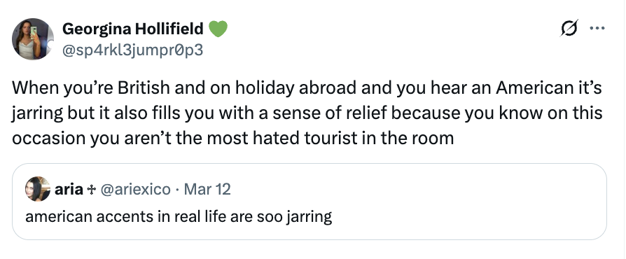 "Whenever an american walks into a room you KNOW an american has walked into the room."