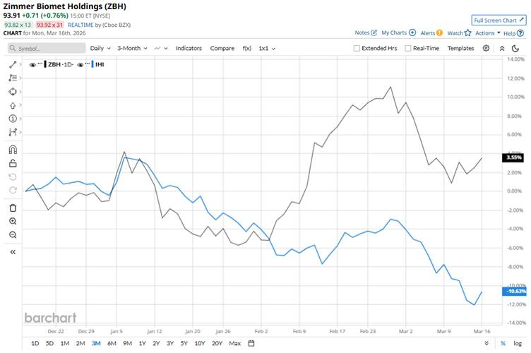 Zimmer Biomet Holdings, Inc. (ZBH) is a leading global medical technology company that specializes in musculoskeletal healthcare solutions, including orthopedic reconstructive implants, sports medicine products, biologics, dental implants, and robotic-assisted surgical technologies used to treat disorders of bones, joints, and supporting soft tissues. Headquartered in Warsaw, Indiana, the company markets its products to hospitals, surgeons, and healthcare providers worldwide through direct sales and distributor networks. Zimmer Biomet currently has a market cap of roughly $18.7 billion. Companies worth $10 billion or more are generally described as “large-cap stocks,” and Zimmer Biomet fits right into that category, with its market cap exceeding this threshold, reflecting its substantial size, influence, and dominance in the medical devices industry. The firm traces its origins to 1927 and has grown into one of the major players in the orthopedic device industry. What Options Traders Expect from Micron Stock After Earnings on March 18 Stocks Set to Open Higher as Bond Yields Fall, Fed Meeting and Middle East Conflict in Focus Stocks Rally as Crude Oil and Bond Yields Fall Get exclusive insights with the FREE Barchart Brief newsletter. Subscribe now for quick, incisive midday market analysis you won't find anywhere else. Zimmer Biomet stock has slipped 17.9% from its 52-week high of $114.44 achieved in April 2025. Nevertheless, the stock has gained a modest 3.3% over the past three months, outpacing the iShares U.S. Medical Devices ETF’s (IHI) 10.8% decline during the same time frame. Moreover, ZBH has gained 4.5% on a YTD basis but slumped 14.6% over the past 52 weeks, compared to IHI’s decline of 10.7% in 2026 and 6.2% over the past year. ZBH is trading below the 200-day moving average but largely above the 50-day moving average this month. Zimmer Biomet stock has shown strength in 2026 mainly due to solid earnings performance and improving demand for orthopedic procedures. The company reported 2025 full-year revenue of $8.2 billion, up 7.2% year-over-year. Also, adjusted EPS rose to $8.20 in 2025 from $8.00 in 2024, above expectations. The company also announced a $1.5 billion share repurchase program that signals confidence in future cash flows. Additionally, excitement around the firm’s robotic-assisted surgery systems and smart implant technologies has strengthened its long-term growth narrative, helping support the stock in 2026. However, Zimmer Biomet has underperformed its peer Medtronic plc (MDT) over the past year. MDT declined 8.6% on a YTD basis and 5.7% dip over the past year. ZBH has a consensus “Hold” rating among the 28 analysts covering it. The mean price target of $102.43 represents a 9.9% premium to current price levels. On the date of publication, Subhasree Kar did not have (either directly or indirectly) positions in any of the securities mentioned in this article. All information and data in this article is solely for informational purposes. This article was originally published on Barchart.com