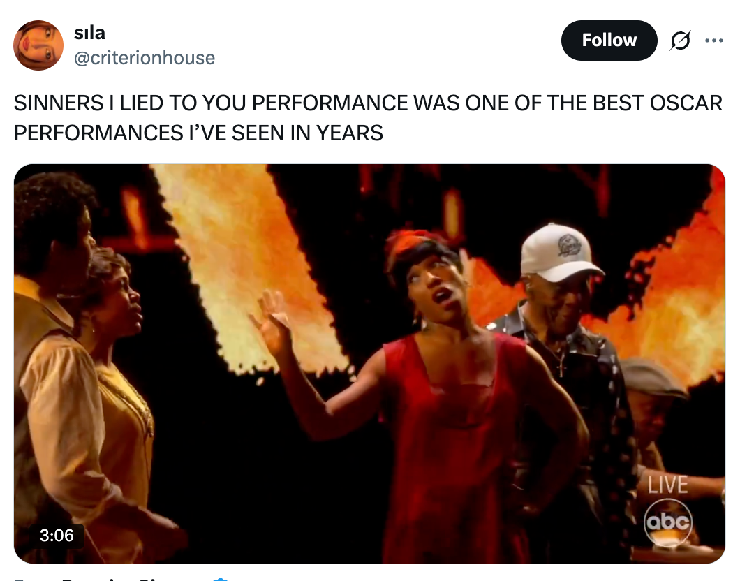 "Misty Copeland comes out of retirement to put Timothée Chalamet in his place during a live ‘Sinners’ performance at the #Oscars." If you must know, I based my entire personality on Seasons 2-5 of "Girls," and I'm a huge gamer. Misty Copeland comes out of retirement to put Timothée Chalamet in his place during a live ‘Sinners’ performance at the #Oscars. pic.twitter.com/EhUIOEw8jg Chalamet when Misty Copeland dances by pic.twitter.com/jpIt3oSUuZ Seeing Misty Copeland back on stage with the Sinners cast and dancers after a hip replacement. Crying tears of joy. #Oscars pic.twitter.com/Zw6z9Ibztz Baby they ain’t even start singing and I was toe up. That juke joint scene MEANS SOMETHING TO ME. #oscars pic.twitter.com/160IGGUqqL Sinners performance giving the ballet dancer a solo with Timothée in the front row pic.twitter.com/LUtayD52gl