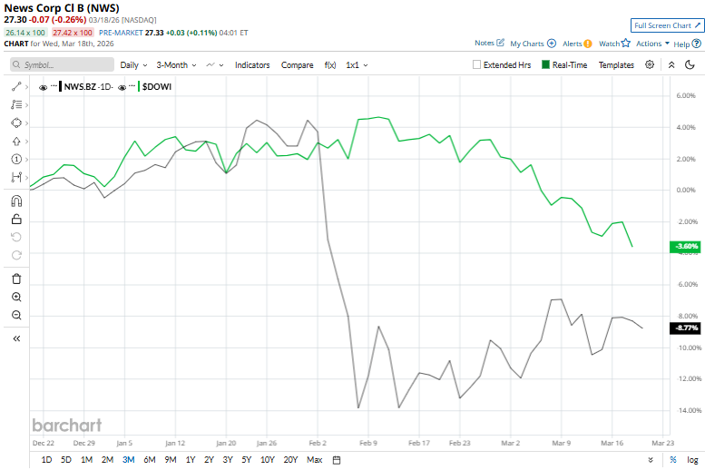 New York-based News Corporation (NWS) is a diversified media and information services company with a global portfolio spanning news publishing, digital real estate, book publishing, and subscription-based content platforms. The company owns well-known assets such as The Wall Street Journal, The Times, and The Australian, alongside digital real estate businesses like REA Group and Move, Inc. (operator of Realtor.com), and book publisher HarperCollins. Valued at approximately $15.2 billion by market capitalization, News Corporation is firmly classified as a “large-cap” stock, well above the $10 billion threshold. Its core strength lies in premium content creation, trusted journalism, and data-driven information services, supported by strong brands and a growing base of recurring subscription revenues. This transition has improved revenue stability and positioned the company for long-term growth in digital media and information services. Following the Fed's Rate Decision, the S&P 500 and Dow Fall to New Closing Lows for 2026 As Tesla Gears Up to Launch Terafab, Is TSLA Stock a Buy? Should You Buy Datavault Stock Before March 19? Get exclusive insights with the FREE Barchart Brief newsletter. Subscribe now for quick, incisive midday market analysis you won't find anywhere else. Despite its strategic pivot toward digital media and information services, News Corporation has remained under pressure. The stock has fallen 23.3% from its 52-week high of $35.58. Over the past three months, shares of News Corp have slid 8.3%, compared to the Dow Jones Industrial Average’s ($DOWI) 4% decline during the same time frame. Weakness is more pronounced over a longer horizon, with shares falling 11.1% over the past year and 18.7% in the last six months, compared to a 10.2% gain in the Dow over the past year and a marginal fall over the past six months. The stock has remained below both its 50-day and 200-day moving averages since early February and October, a clear technical signal that downside momentum continues to dominate the trend. News Corporation has trailed the broader market over the past year due to a combination of ongoing pressure in its traditional news media segment, slower-than-expected monetization of digital initiatives, and cyclical softness in advertising and real estate-related businesses. While the company is transitioning toward higher-margin, subscription-driven and digital revenue streams, this shift has been gradual and has not fully offset declines in legacy operations. Additionally, macroeconomic uncertainty and uneven performance across segments have weighed on investor sentiment, limiting the stock’s ability to keep pace with broader market gains. Top competitor, Cinemark Holdings, Inc. (CNK) has outpaced NWS, rising 6.5% over the past year and sinking 4.5% over the past six months. Nevertheless, Wall Street hasn’t lost faith in NWS. News Corp carries a unanimous “Strong Buy” rating from all three analysts covering the stock. The stock’s average price target of $39 suggests a compelling upside of 42.9% from current price levels. On the date of publication, Kritika Sarmah did not have (either directly or indirectly) positions in any of the securities mentioned in this article. All information and data in this article is solely for informational purposes. This article was originally published on Barchart.com