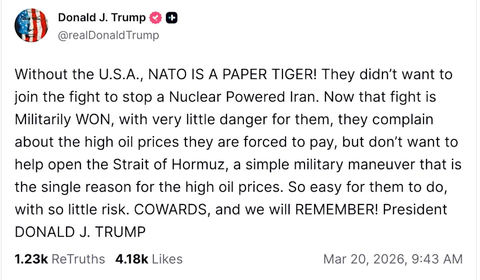 Donald Trump is facing a revolt from his once-counted-upon allies over his war in Iran. Protesters in NATO ally countries raged against Trump, 79, on Saturday, taking to the streets in demonstrations against the United States and Israel over the surprise war in Iran, which began on Feb. 28. In Montreal, hundreds of demonstrators wielded megaphones and held signs disparaging Trump and Israeli Prime Minister Benjamin Netanyahu. “Israel and Pedophile Trump Bombs Iran Over Lies Now Your Family Struggles As Food & Gas Goes Up!” one large banner read, according to footage of the demonstrations. Another demonstrator held figurines depicting Trump and Netanyahu wearing bloodied aprons. A similar sentiment emerged in Madrid, where 4,000 demonstrators gathered for a rally, according to reports. Earlier in March, Trump labeled the country a “loser” after Spanish Prime Minister Pedro Sánchez did not allow the use of their shared military bases for the war. Other protests in Edinburgh and Amsterdam were held in conjunction with the International Day for the Elimination of Racial Discrimination, which was designated by the United Nations after South African authorities opened fire on a peaceful anti-apartheid demonstration in 1960, killing 69 people in what is now known as the Sharpeville Massacre. The international outcry over the conflict—which has killed thousands in Iran and neighboring countries, including 13 U.S. servicemembers—comes as the president has repeatedly raged against NATO allies for their lack of support for the war he started without consulting them. “Without the U.S.A., NATO IS A PAPER TIGER!” Trump ranted on Truth Social on Friday. “They didn’t want to join the fight to stop a Nuclear Powered Iran.” The president went on to declare victory against Iran—as he has done repeatedly, only to reverse course and threaten new military strikes hours later—and berate allied leaders for not assisting the United States in keeping the Strait of Hormuz, a waterway through which a fifth of the world’s oil travels, open amid the conflict. “Now that fight is Militarily WON, with very little danger for them, they complain about the high oil prices they are forced to pay, but don’t want to help open the Strait of Hormuz, a simple military maneuver that is the single reason for the high oil prices,” he wrote. “So easy for them to do, with so little risk. COWARDS, and we will REMEMBER!” the president continued. Trump escalated his verbal attacks on his NATO counterparts this week as oil prices surged—Brent crude, the global benchmark, briefly approached $120 a barrel at its peak. On Thursday, Trump complained in the Oval Office that NATO did not want to help defend the Strait, but claimed, “Now they’re getting much nicer because they’re seeing my attitude.” “As far as I’m concerned, it’s too late,” Trump declared. For their part, some European leaders have stood firmly behind NATO’s stated mission to defend allied countries from attacks, not provoke them. “France’s posture is unchanged: Defensive. Protective,” French Response, the official X account of France’s foreign ministry, wrote in a March 16 post responding to another threat from Trump. Little support for Trump and Israel’s war on Iran exists among allied countries. An IPSOS poll from March 18 found that 80 percent of British respondents expressed “concern” over the economic impact of the conflict, while 79 percent of French citizens said they fear it will spread beyond the Middle East. Additionally, a majority of Canadians (60 percent) disapprove of the U.S. strikes, which were launched without congressional approval. The Daily Beast has reached out to the White House for comment.