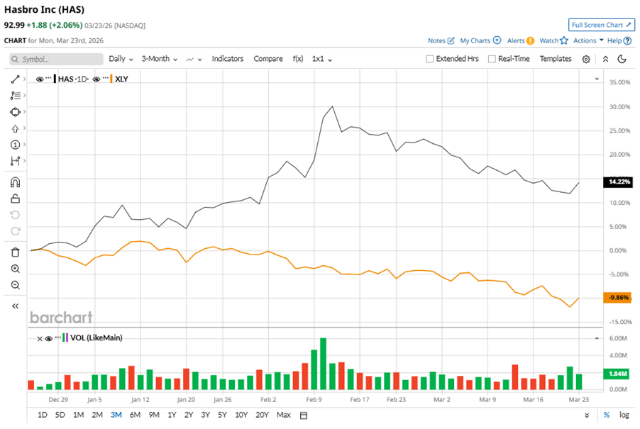 Hasbro, Inc. (HAS), headquartered in Pawtucket, Rhode Island, functions as a toy and game company. Valued at $12.8 billion by market cap, the company offers a diverse range of toys, games, interactive software, puzzles, and infant products through popular brands like MAGIC: THE GATHERING, Hasbro Gaming, PLAY-DOH, NERF, TRANSFORMERS, DUNGEONS & DRAGONS, PEPPA PIG, and more. Companies worth $10 billion or more are generally described as “large-cap stocks,” and HAS definitely fits that description, with its market cap exceeding this threshold, reflecting its substantial size, influence, and dominance in the leisure industry. Hasbro's strengths include iconic brands, global distribution, strategic licensing, digital transformation, and innovation. These drive its market reach and revenue growth. Stock Index Futures Rally as Oil Prices Tumble on U.S.-Iran Talks Unusual Options Activity Flares in META and SMCI Stock: What to Watch Next Down 12% from Its Highs, Should You Buy the Sandisk Stock Dip? Tired of missing midday reversals? The FREE Barchart Brief newsletter keeps you in the know. Sign up now! Despite its notable strength, HAS slipped 13.1% from its 52-week high of $106.98, achieved on Feb. 12. Over the past three months, HAS stock gained 14.2%, outperforming State Street Consumer Discretionary Select Sector SPDR ETF’s (XLY) 9.9% dip during the same time frame. Shares of HAS rose 24.3% on a six-month basis and climbed 53.5% over the past 52 weeks, outperforming XLY’s YTD losses of 7.4% and 11.5% returns over the last year. To confirm the bullish trend, HAS has been trading above its 200-day moving average since mid-May, 2025. However, the stock is trading below its 50-day moving average since mid-March. Hasbro's Q4 results were strong, driven by massive growth in MONOPOLY, Peppa Pig, Marvel, and Wizards of the Coast's Magic: The Gathering. The consumer products division returned to growth, and new licensing deals with Warner Bros. Discovery, Inc. (WBD), The Walt Disney Company (DIS), and Amazon.com, Inc. (AMZN) are expected to fuel future launches. On Feb. 10, HAS shares closed up by 7.5% after reporting its Q4 results. Its adjusted EPS of $1.51 exceeded Wall Street expectations of $0.99. The company’s revenue was $1.4 billion, exceeding Wall Street forecasts of $1.3 billion. In the competitive arena of leisure, Mattel, Inc. (MAT) has lagged behind HAS, with an 11.6% downtick over the past six months and 23.8% losses over the past 52 weeks. Wall Street analysts are bullish on HAS’ prospects. The stock has a consensus “Strong Buy” rating from the 15 analysts covering it, and the mean price target of $113.07 suggests a notable potential upside of 21.6% from current price levels. On the date of publication, Neha Panjwani did not have (either directly or indirectly) positions in any of the securities mentioned in this article. All information and data in this article is solely for informational purposes. This article was originally published on Barchart.com