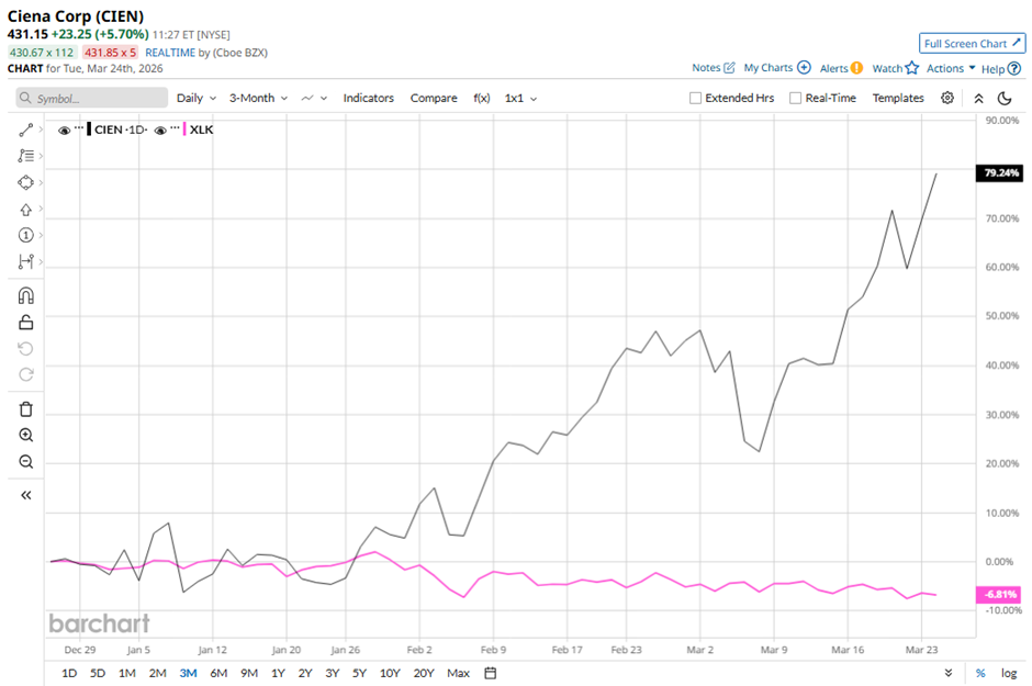With a market cap of $57.7 billion, Ciena Corporation (CIEN) is a global network technology company that provides hardware, software, and services to network operators across regions including the Americas, Europe, Asia-Pacific, and India. Its offerings span optical networking, routing and switching platforms, network control software, and automation solutions through segments like Networking Platforms, Platform Software, Blue Planet, and Global Services. Companies valued at $10 billion or more are generally considered "large-cap" stocks, and Ciena fits this criterion perfectly. Headquartered in Hanover, Maryland, the company also delivers consulting, integration, and support services to help customers design, deploy, and manage advanced networks. Stock Index Futures Rally as Oil Prices Tumble on U.S.-Iran Talks Unusual Options Activity Flares in META and SMCI Stock: What to Watch Next Down 12% from Its Highs, Should You Buy the Sandisk Stock Dip? Get exclusive insights with the FREE Barchart Brief newsletter. Subscribe now for quick, incisive midday market analysis you won't find anywhere else. Shares of Ciena have pulled back marginally from its 52-week high of $432.18. The stock has surged 77.9% over the past three months, surpassing the broader State Street Technology Select Sector SPDR ETF's (XLK) nearly 7% decline. CIEN stock has climbed 82.8% on a YTD basis, exceeding XLK's 5.5% decrease. Longer term, shares of the networking systems provider have jumped 514.8% over the past 52 weeks, compared to XLK’s 25.1% gain during that period. The stock has been trading above its 50-day and 200 moving averages since May 2025. Ciena Corporation has been outperforming due to strong AI-driven demand for high-speed optical networking solutions, supported by cloud expansion and rising data center connectivity needs. Despite stronger-than-expected Q1 2026 adjusted EPS of $1.35 and revenue of $1.43 billion, shares of Ciena plunged 12.9% on March 5. Its full-year fiscal 2026 revenue guidance of $5.9 billion - $6.3 billion (midpoint $6.1 billion) came in far below the analyst consensus. In comparison, rival Lumentum Holdings Inc. (LITE) has significantly outpaced CIEN stock. LITE stock has climbed 111.4% on a YTD basis and 958.3% over the past 52 weeks. Despite the stock's underperformance relative to its peers, analysts are moderately optimistic about its prospects. CIEN stock has a consensus “Moderate Buy” rating overall from the 18 analysts covering the stock, and as of writing, it is trading above the mean price target of $343.53. On the date of publication, Sohini Mondal did not have (either directly or indirectly) positions in any of the securities mentioned in this article. All information and data in this article is solely for informational purposes. This article was originally published on Barchart.com