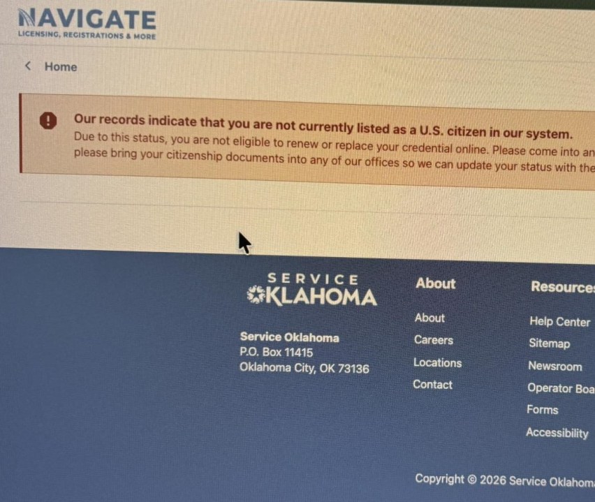 OKLAHOMA CITY (KFOR) — Some Oklahomans are having trouble renewing their driver’s license online. Last month, Service Oklahoma updated its system to make driver’s licenses and vehicle services fast. Service Oklahoma to launch faster, unified system for driver license and vehicle services However, some say they’re receiving a message that says they are not U.S. citizens. “Our records indicate that you are not currently listed as a U.S. citizen in our system,” said Ceciley Thomason, a woman trying to obtain a state driver’s license. This is the message some Oklahomans are getting while trying to obtain a license online. I’m going to be honest, it was alarming because around that time there were some very scary things going on with immigration,” said Thomason. Ceciley Thomason was trying to get a state driver’s license online after she moved. “My husband, he does have a real ID already, and he was able to go in through, no problem,” said Thomason. “Then, when I went to go change or update my ID, I got the screenshot that you saw on Facebook, where it says, we don’t have you as a citizen. I was like, that’s strange.” Thomason is a citizen of the Cherokee Nation. She says she already has a tribal driver’s license and passport card. Thomason says while filling out the information online, she input her driver’s license number and social security number, but still received the message. She tried multiple browsers but was still told she is ‘not listed as a U.S. citizen.’ “I cannot imagine being someone who is going through this and also actively worried about an immigration issue,” said Thomason. News 4 reached out to Service Oklahoma about this issue. We’re aware that some customers may see this message when attempting to complete a renewal online. While the wording is not as clear as it should be, it is simply indicating that additional information is needed before the transaction can be completed. Not all customers are eligible to renew online for a variety of reasons, including when certain documentation needs to be verified. In these cases, customers can quickly complete their renewal in person at a Service. Oklahoma location or with a licensed operator. We are updating our messaging to ensure it is more clear and helpful for customers moving forward. Service Oklahoma Thomason recently went to the tag agency to handle the issue in person, but at last check, the status of her license is not pending, and she still receives the same message. Copyright 2026 Nexstar Media, Inc. All rights reserved. This material may not be published, broadcast, rewritten, or redistributed. For the latest news, weather, sports, and streaming video, head to KFOR.com Oklahoma City.