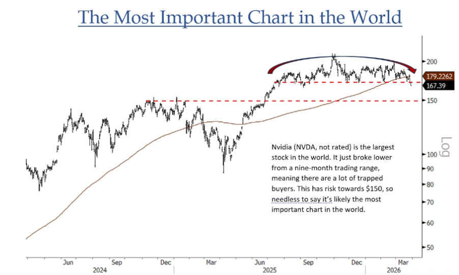 If Nvidia (NVDA) stock is a great proxy for the broader stock market, then this AI leader may be leading the rest of the market even lower from its recent doldrums. Nvidia sports the "most important chart in the world" right now (see below), according to BTIG technical strategist Jonathan Krinsky. He explained, "Nvidia is the largest stock in the world. It just broke lower from a nine-month trading range, meaning there are a lot of trapped buyers. This has risk towards $150, so needless to say, it's likely the most important chart in the world." Nvidia shares currently trade at $168, or 10% above where Krinsky thinks the stock could fall. The chipmaker's stock price has tanked 15% from its recent peak. Despite a solid GTC 2026 conference in early March, where CEO Jensen Huang revealed a $1 trillion revenue pipeline through 2027, Nvidia stock has been hit by a "sell the news" reaction from investors who are questioning how much growth is already baked into its premium valuation. The company faces other headwinds as well. While Nvidia dominates the AI "training" chip market, there is growing uncertainty about how quickly it can monetize the shift to AI inference (running models in production). Analysts are waiting for tangible proof that Blackwell Ultra shipments will translate into immediate earnings beats and that the recent Grok acquisition makes strategic sense. "Nvidia ... continues to ramp Blackwell production (GB200+GB300) while simultaneously preparing for the imminent ramp of its Vera Rubin platform (on track for the second half of 2026)," JPMorgan analyst Harlan Sur wrote in a note. "Even so, the stock response [post-earnings] suggests investors were left wanting more, which we think is tied to continued uncertainty around the growth trajectory for Nvidia's data center business in 2027." Meanwhile, the ongoing volatility from Operation Epic Fury has sparked a massive rotation out of high-beta tech stocks like Nvidia and Meta (META) and into "physical" safe havens like energy and defense. As of Mar. 29, the S&P 500 (^GSPC), Nasdaq Composite (^IXIC), and Dow Jones Industrial Average (^DJI) have all officially entered correction territory, marking declines of at least 10% from their recent record highs. The Nasdaq was the first to succumb on Mar. 28. Brian Sozzi is Yahoo Finance's Executive Editor and a member of Yahoo Finance's editorial leadership team. Follow Sozzi on X @BrianSozzi, Instagram, and LinkedIn. Tips on stories? Email brian.sozzi@yahoofinance.com. Click here for in-depth analysis of the latest stock market news and events moving stock prices Read the latest financial and business news from Yahoo Finance