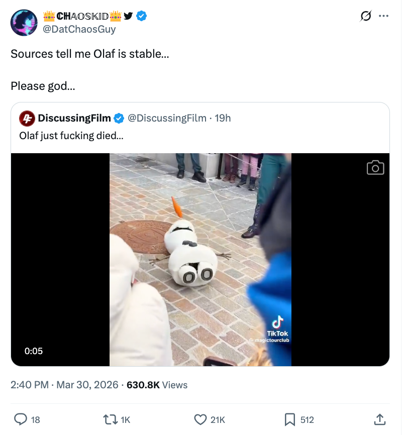 Over 31 Million People Are Losing It At This Video Of Robot Olaf "Dying" At Disneyland