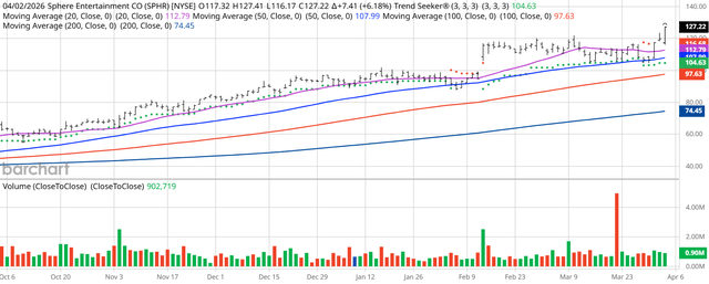 Sphere Entertainment (SPHR) is trading at a new all-time high and has strong technical momentum. Shares are up nearly 280% over the past 52 weeks. SPHR maintains a 100% “Buy” technical opinion from Barchart. Despite bullish technicals and analyst sentiment, elevated short interest warrants close monitoring. Valued at $4.25 billion, Sphere Entertainment (SPHR) is a premier live entertainment and media company. The company includes Sphere, a next-generation entertainment medium. I found today’s Chart of the Day by using Barchart’s powerful screening functions to sort for stocks with the highest technical buy signals; superior current momentum in both strength and direction; and a Trend Seeker “buy” signal. I then used Barchart’s Flipcharts feature to review the charts for consistent price appreciation. SPHR checks those boxes. Since the Trend Seeker issued a new “buy” on March 31, SPHR stock is up 8.36%. Stocks Pare Losses on Hormuz Report Stocks Recover on Hopes Strait of Hormuz Could Soon Reopen Dear Tesla Stock Fans, Mark Your Calendars for April 3 Markets move fast. Keep up by reading our FREE midday Barchart Brief newsletter for exclusive charts, analysis, and headlines. Editor’s Note: The technical indicators below are updated live during the session every 20 minutes and can therefore change each day as the market fluctuates. The indicator numbers shown below therefore may not match what you see live on the Barchart.com website when you read this report. These technical indicators form the Barchart Opinion on a particular stock. Sphere scored a 5-year high of $127.41 on April 2. Sphere has a Weighted Alpha of +345.63. SPHR has a 100% “Buy” opinion from Barchart. The stock has gained 279.99% over the past 52 weeks. Sphere has its Trend Seeker “Buy” signal intact. The stock recently traded at $127.22 with a 50-day moving average of $107.99. SPHR has made 6 new highs and gained 11.21% over the past month. Relative Strength Index (RSI) is at 65.84. There’s a technical support level around $119.79. $4.25 billion market capitalization. Revenue is expected to grow 10.32% this year and another 1.84% next year. Earnings are estimated to decrease by 182.96% this year but increase again by 14.54% next year. The Wall Street analysts followed by Barchart gave the stock 9 “Strong Buy,” 1 “Moderate Buy” and 3 “Hold” opinions with price targets between $110 and $150. Value Line gives the stock its “Above Average” rating. CFRA’s MarketScope rates the stock a “Hold.” Morningstar thinks the stock is 10% overvalued. Only 1 investor following the stock on Motley Fool thinks it will beat the market. 9,750 investors are following the stock on Seeking Alpha, which rates it a “Strong Buy.” Short interest is high at 19.84% of the float with 7.46 days to cover the float. Analysts do not have great earnings projections for this year. The short Interest is very high at 19.84%. This bothers me. Monitor the short interest and see where it goes before making your decision. Additional disclosure: The Barchart Chart of the Day highlights stocks that are experiencing exceptional current price appreciation. They are not intended to be buy recommendations as these stocks are extremely volatile and speculative. Should you decide to add one of these stocks to your investment portfolio it is highly suggested you follow a predetermined diversification and moving stop loss discipline that is consistent with your personal investment risk tolerance. On the date of publication, Jim Van Meerten did not have (either directly or indirectly) positions in any of the securities mentioned in this article. All information and data in this article is solely for informational purposes. This article was originally published on Barchart.com