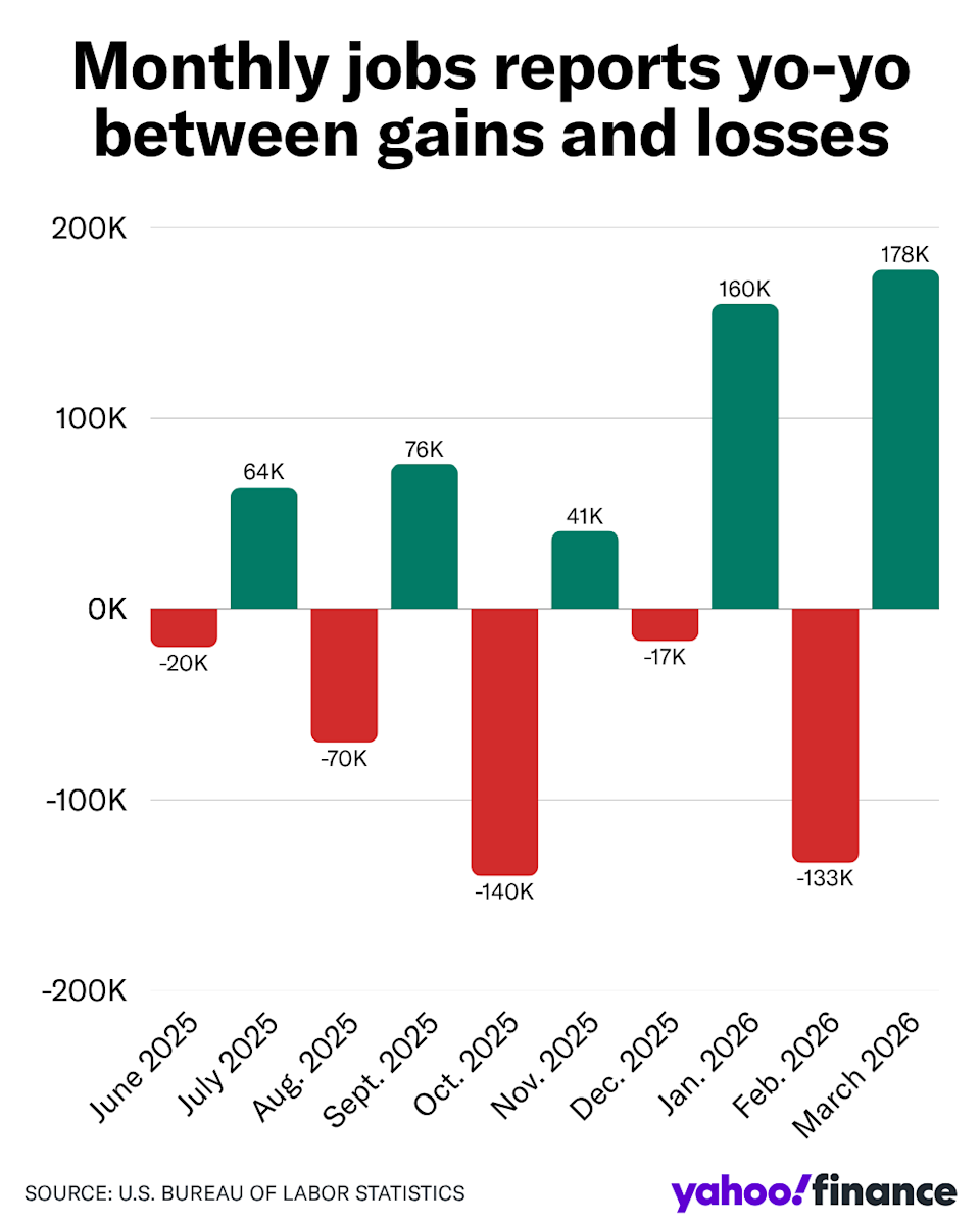 The US economy added 178,000 jobs in March, soaring past expectations, the Labor Department said Friday. The unemployment rate edged down to 4.3%. Economists surveyed by Bloomberg had expected a gain of 65,000 jobs, reversing February’s drop. That month’s loss grew even bigger with revisions: from 92,000 to a new figure in Friday’s report of 133,000. Economists had projected no change in the unemployment rate from February’s 4.4%. Friday’s data offers a picture of the job market just as the US-Israel war on Iran began to weigh on an economy already slogging through a weak hiring rate. Read more about the state of the US jobs market. While overall job growth was better than anticipated, the share of people who have been without work for 27 weeks or more as a percentage of all unemployed ticked up slightly to 25.4%, underscoring how difficult it is to secure a position for those already out of work, even as layoffs remain relatively low. The number of “marginally attached” workers — those who wanted work but hadn’t recently looked for a job — increased by 325,000 in March, the Labor Department said, while discouraged workers who believed no jobs were available to them rose by 144,000. Much of March’s gain can be attributed to growth in one key sector: healthcare. A strike of healthcare workers pulled February’s payrolls down, only for the sector to add 76,000 jobs in March and push overall job growth higher. Positions were also added in construction, transportation, and warehousing. “March’s report showed stronger gains than anticipated, offering an early signal that employers may be moving ahead with hiring plans more decisively than earlier in the quarter,” Ger Doyle, North America regional president at Manpower Group, said in a statement. But there’s still the war with Iran, which could strain a delicate labor market, as well as developments in artificial intelligence. “In our baseline for 2026, we expect a weaker job market but not one where unemployment rises so much as to tip us into recession,” Atsi Sheth, chief credit officer at Moody’s Ratings, said Friday. “We’ll keep assessing that expectation over future jobs data releases, closely watching employment trends in sectors most affected by the energy and supply chain disruption of the Middle East conflict, those subject to technology-driven labor displacement, and those where waning consumer demand squeezes margins.” Sign up for the Mind Your Money newsletter Click here for the latest personal finance news to help you with investing, paying off debt, buying a home, retirement, and more Read the latest financial and business news from Yahoo Finance