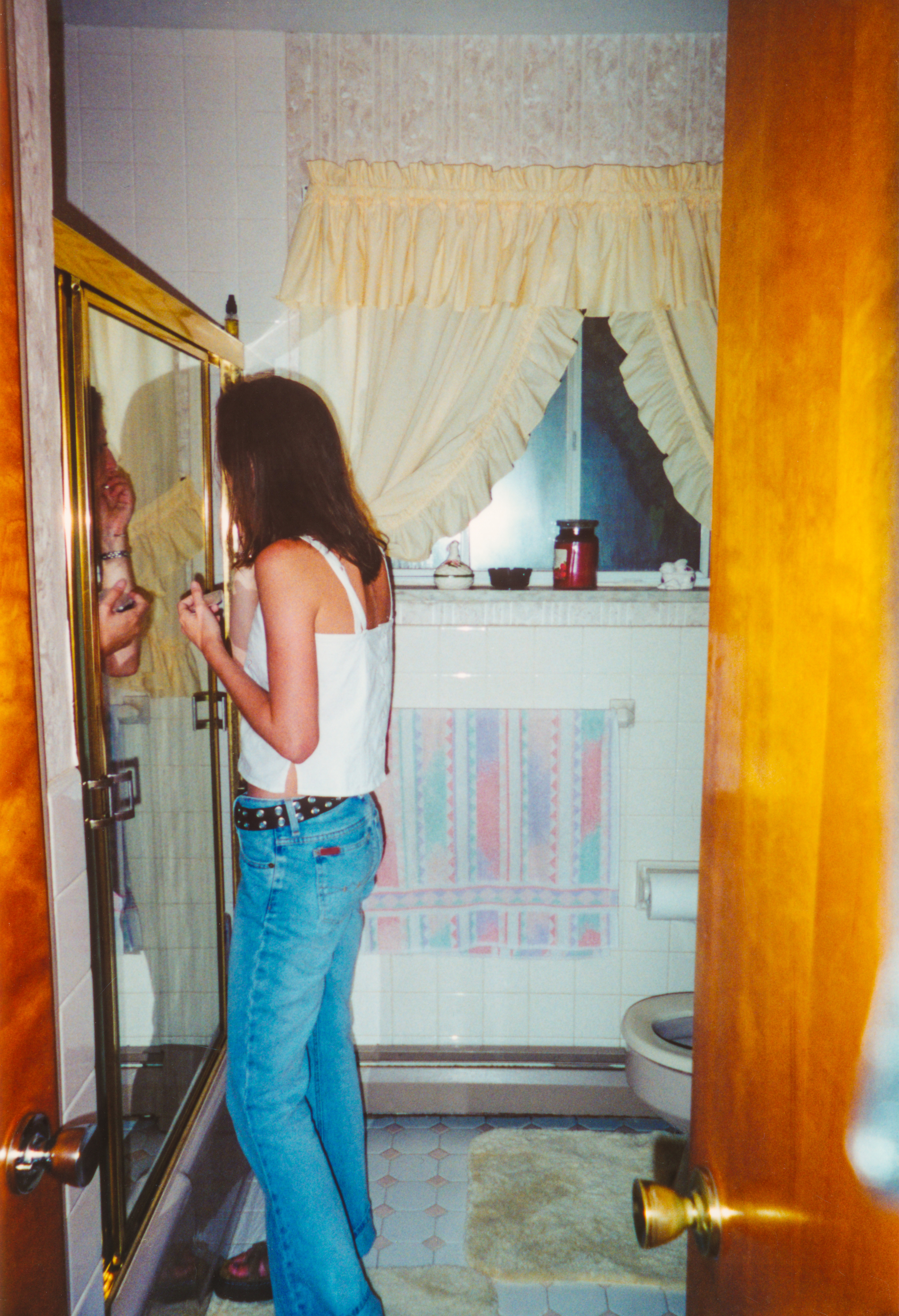 Sponge-painted walls still haunt my dreams. Vintage Y2K style young woman putting on makeup in bathroom mirror. Real life, real people full length portrait, candid portrait. Teenager is standing, getting ready in bathroom with outdated home decor from the 90s 2000s. Vintage family photo of teenage girl primping in vintage bathroom interior, vintage 1990s home interior.