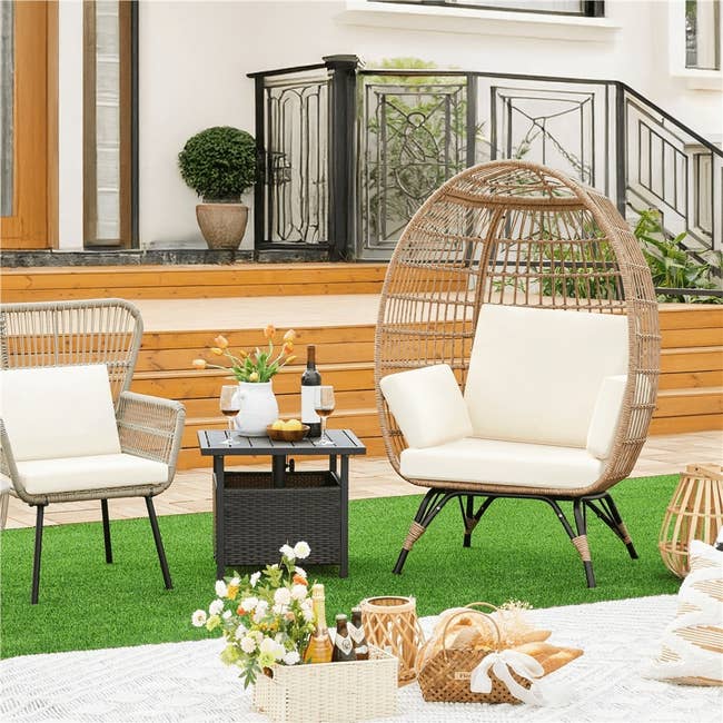 We hope you love our recommendations! While every product is independently chosen by our editors, BuzzFeed and our publishing partners may collect a share of sales or other compensation from the links on this page. You can read more about how our affiliate partnerships work in our Editorial Standards & Ethics Guide. Stunning finds that will make your backyard, patio, or balcony hangout ready. Promising review: "These chairs are nothing shy of AMAZING! They're built so well, the quality is fantastic, and chair covers are included!" —Daren Promising review: "We bought these lights for an outdoor patio wall. They are perfect. The size is medium, large enough to give light but not overpowering. They were simple to hang, and the look is just great. The price was right, too." —Sharon Promising review: "We have four of these we purchased several years ago. They sit outside year-round in the summer sun and winter temperatures in the single digits with freezing and thawing. All four look the same, in perfect condition, and still beautiful." —Gary Promising review: "This pool is perfect!!! We needed a pool that wasn't taller than our 3-year-old grandson, so we could all enjoy the pool. This pool is the perfect height. Our grandson can stand and move around on his own, and the adults are able to sit and relax without needing a pool float. The best part is the canopy that can be utilized to get out of the hot Arizona sun. The liner and frame are very durable. I would highly recommend this product!" —Beth Price: $178+ (originally $299.99+; available in five sizes) Promising review: "Perfect size grill for two people. I actually got this one to replace my bigger grill, because for just two people, this will cook everything you need. Easier to store and will use less charcoal than a bigger grill. Easy to assemble, too. We're happy with it." —Amy Promising review: "Love that its so easy to clean and that you can use either side. Needed something to go under my outdoor dining set and this was perfect." —Cristina Price: $19.79+ (originally $26.99+; available in six sizes, seven colors, and with or without LED lights) Promising review: "Great addition to the front porch next to our rocking chair . Could easily be used inside or outside." —Heather Price: $61.65+ (available in four colors) Promising review: "I have a decently sized patio, but an overall pretty small backyard space. I've always wanted to spend more time out there, and this hammock allows me to do just that. Very easy to set up and also very sturdy and strong. I've definitely spent more time 'working from home' (wink) out there since I purchased it. Would definitely recommend." —LaToya Promising review: "This is one of those items that I knew I didn't need, but I wanted it. It was totally worth a splurge. We are very happy with the flame that is emitted by this fire bowl. We have never owned a fire bowl before, but have enjoyed this to roast s'mores on our small porch. The flame is a great size, and it's so much fun for small gatherings." —Benjamin Price: $375.72+ (available in eight colors) Promising review: "Easy to assemble, it seems sturdy, it looks fantastic, it is self-watering and has a drain if you get too much rain." —Joyce Price: $179.99+ (available in two sizes and three colors) Promising review: "Love, love, love these side tables! They match my patio furniture perfectly. Everyone who sees them wants to know where I got them. They look expensive but weren't. Love that they have a cooler in them." —1MSNana Price: $66.82 (originally $83.52+; available in two styles and four colors) Promising review: "Love the sound, and it is portable, stick in the ground, or hang on a hook. Love the three different flame brightness. 🥰♥️ There's 12 hours of music before charging." —BlancheMarie1 Promising review: "This firepit is perfect for patio gatherings. Easy to assemble and small enough you can pick it up and move locations if need be. Definitely worth the money!" —Cheryl Promising review: "This product is very sturdy and has really good sounds. And it helps that it's waterproof and solar." —GoodWorker Promising review: "This table looks nice, seems sturdy and was super easy to assemble. Definitely recommend!" —Walmart customer Promising review: "Super fun backyard activity for our family." —Anonymous Promising review: "We love this patio set in the mint green color. It is perfect for having coffee or lunch or just relaxing in the garden. I was surprised by the high quality of this set. It has a solid baked-on paint surface that is easy to clean and doesn't look like it will chip or degrade. Highly recommend." —Jean Price: $84.99+ (available in six colors) Promising review: "This umbrella is the perfect answer to the blinding, hot sunshine on my 10 x 11 patio. It looks great, giving the patio a whole new "spa" kind of vibe." —Bell Promising review: "I recently added this steel patio side table next to my swing, and it was the perfect finishing touch to my outdoor space. The table is sturdy, weather-resistant, and just the right size for a coffee cup, book, or even a small snack tray. It looks sleek and modern, blends beautifully with my swing setup, and makes my relaxation zone feel complete. Now I can truly kick back with everything I need within reach—whether it's my morning coffee or an evening drink after a long day." —anonymous Price: $29.99+ (available in six colors) Promising review: "Sleek and modern design with a sturdy metal body—definitely not the cheap plastic you often see. I love the variety of settings, and for the price, the value is hard to beat." —Lacy Promising review: "I have 9 of these lamps, and I started with only 2 because I am cautious. But - they are perfect... I have them on plant hangers around my pool and in my green room, and they are a great addition. They are low light, but it's not obnoxiously bright while still providing a relaxing and lit atmosphere." —Dusch