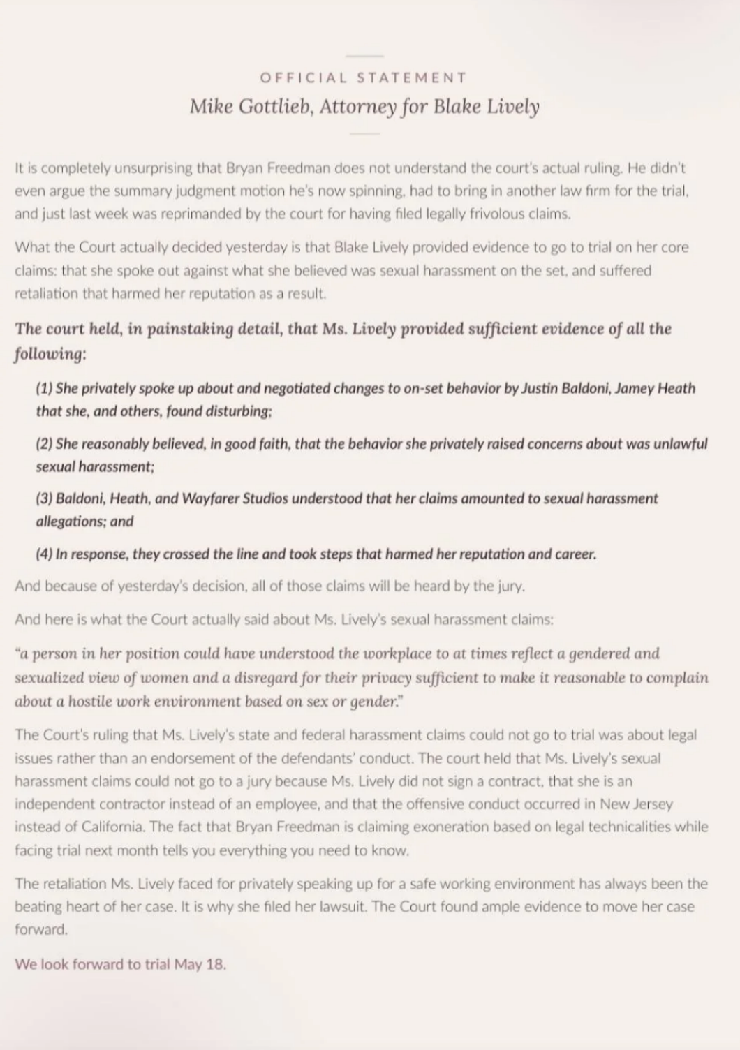 Blake Lively Spoke Out Against People Who Dismiss Her Lawsuit As "Celebrity Drama"