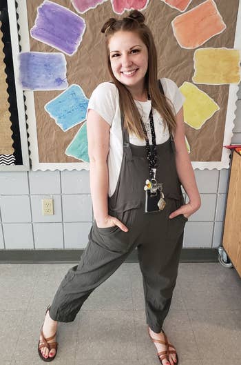 Promising review: "I am obsessed with this jumpsuit. Perfect for teaching in, has pockets, very stretchy, easy to pull off and on. Thin to medium weight, so it is not hot on me and perfect for spring and summer. Has a 25-inch inseam, but the crotch sits lower on me, and I am 5’2”. Hits perfect for me — I can still wear a sandal, and this barely grazes the floor. I love wearing this layered at the moment with fitted long sleeve T-shirts. Nothing fancy, but it is adorable, and I kept getting compliments from students as well. I do wear an underwear shaper with this to smooth me out, but this feels like wearing pajamas. I have these in a size large. I am 150 pounds, 5’2”. I just ordered another pair and will have them in four different colors. Highly recommend." —sebn1111