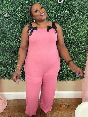 Promising review: "I LOVE this velvet jumpsuit. I recently wore it to a holiday party and got so many compliments! I bought this on an impulsive whim and I'm glad I did! I never wear pink but this color just stood out to me above the rest. I love that it has some stretch. (Honestly I probably could have sized down but I like my clothes to have some wiggle room). The length was perfect for me. The straps are adjustable which is a huge plus bc now I don't have to worry if they'll be slipping off my shoulder all night. Annnddd it has POCKETS! I was so incredibly comfortable all night in this outfit and I felt so glamorous. I was told I looked like a Charlie's Angel....so obviously I felt like a bada$$ too." —afton clouse