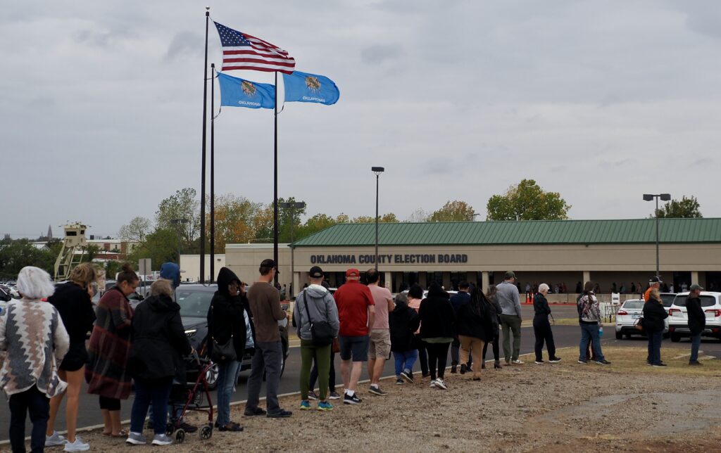 Voters wait in line outside the Oklahoma County Election Board on Oct. 30 to cast a vote in the Nov. 5 election. (Photo by Emma Murphy/Oklahoma Voice) OKLAHOMA CITY — Over 13,000 Oklahomans have changed their party affiliation this year ahead of the closed June primary elections, according to a state report. Since Jan. 1, independent voters comprised the largest shift in party affiliation with more than 6,100 selecting a party, according to data from the State Election Board, which allows them to participate in Oklahoma’s partisan primaries in June and August. Nearly 2,400 independent voters became registered Republicans while over 3,600 joined the Democratic party, an Election Board report shows. While no recognized political party in Oklahoma filed paperwork to allow independent voters to participate in their primaries this year, it was not clear if the affiliation changes were higher than normal. The State Election Board said it could not run a report on party affiliation changes during the same period in 2022. Records show nearly 3,000 Republican voters changed their party affiliation since Jan. 1. Over 1,700 of these became independent voters and 1,100 switched to the Democrat party. Over 3,700 Democrats switched parties, with over 2,300 changing to Republican and nearly 1,400 becoming independents. About 100 Libertarians became registered Republicans, 150 switched to the Democratic party and another 150 became independent voters. Voters had until March 31 to change their party affiliation ahead of a blackout period stretching from April 1 to Aug. 31. There are nearly 2.42 million registered voters in Oklahoma. About 53% are registered Republicans, 25% are Democrats, over 20% are independent and nearly 1% are Libertarians. Primary elections are June 16. The runoff primary is Aug. 25. and the general election is Nov. 3. First-time voters must register by May 22 to participate in the primary elections. SUBSCRIBE: GET THE MORNING HEADLINES DELIVERED TO YOUR INBOX SUPPORT: YOU MAKE OUR WORK POSSIBLE