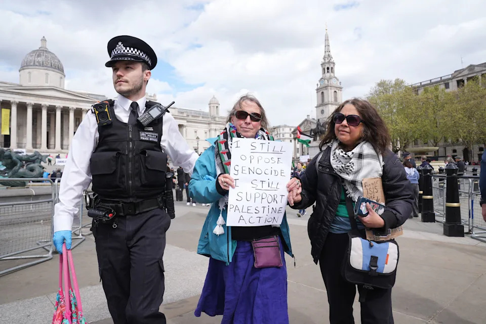 LONDON (AP) — London police arrested more than 200 people on Saturday during a protest against a ban on the group Palestine Action that the government has labeled a terrorist organization. Metropolitan Police said they had detained 212 protesters between the ages of 27 and 82 for supporting the group. Britain’s High Court ruled in February that the government’s decision to outlaw the protest group as a terrorist organization was unlawful, but it kept the ban in place while the government appeals. Police had warned in advance of the protest organized by the group Defend Our Juries that it would make arrests. Hundreds gathered in Trafalgar Square to show their support for the group, with some holding signs reading, “I oppose genocide. I support Palestine Action." Musician Robert Del Naja of the trip hop group Massive Attack said he held a sign in support of the group despite the possibility that an arrest could jeopardize his ability to travel. “I thought this is ridiculous and then the police making that U-turn to arrest people again, I thought that is even more ridiculous," he said. “So I’m going to hold a sign today." Protesters yelled “shame on you” at police carrying away protesters and mocked them for arresting the elderly. “Yeah, she looks like a terrorist, doesn’t she mate?" a woman yelled as police led a protester with a walking stick to a police van.