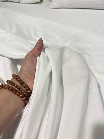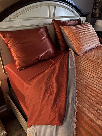 Promising review: "I can honestly say these are the best queen-size sheets I’ve ever owned. From the moment I put them on my bed, I noticed the difference. They are incredibly soft, silky, and lightweight while still feeling durable and well-made. The cooling effect is real, perfect for hot sleepers like me who usually toss and turn at night. The deep pockets fit my queen mattress perfectly without slipping, and even after washing, they come out looking and feeling just as good as new. The fabric drapes beautifully. If you’re looking for sheets that are breathable, comfortable, and truly make a difference in your sleep quality, I highly recommend them." —Patty Barboza