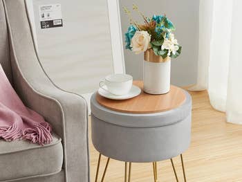 Promising review: "I was using a small foldable step stool in my bedroom to reach the top shelves of my wardrobe. But you know, those things aren’t pretty. It wasn’t bringing me joy, just begrudging utility. This ottoman brings me joy. It’s pretty, it’s lightweight so I can move it easily to use it as a step stool, and the storage capacity is perfect for things like my nightly moisturizers, my Kindle, and journals, and other little miscellaneous things." —Monica N.