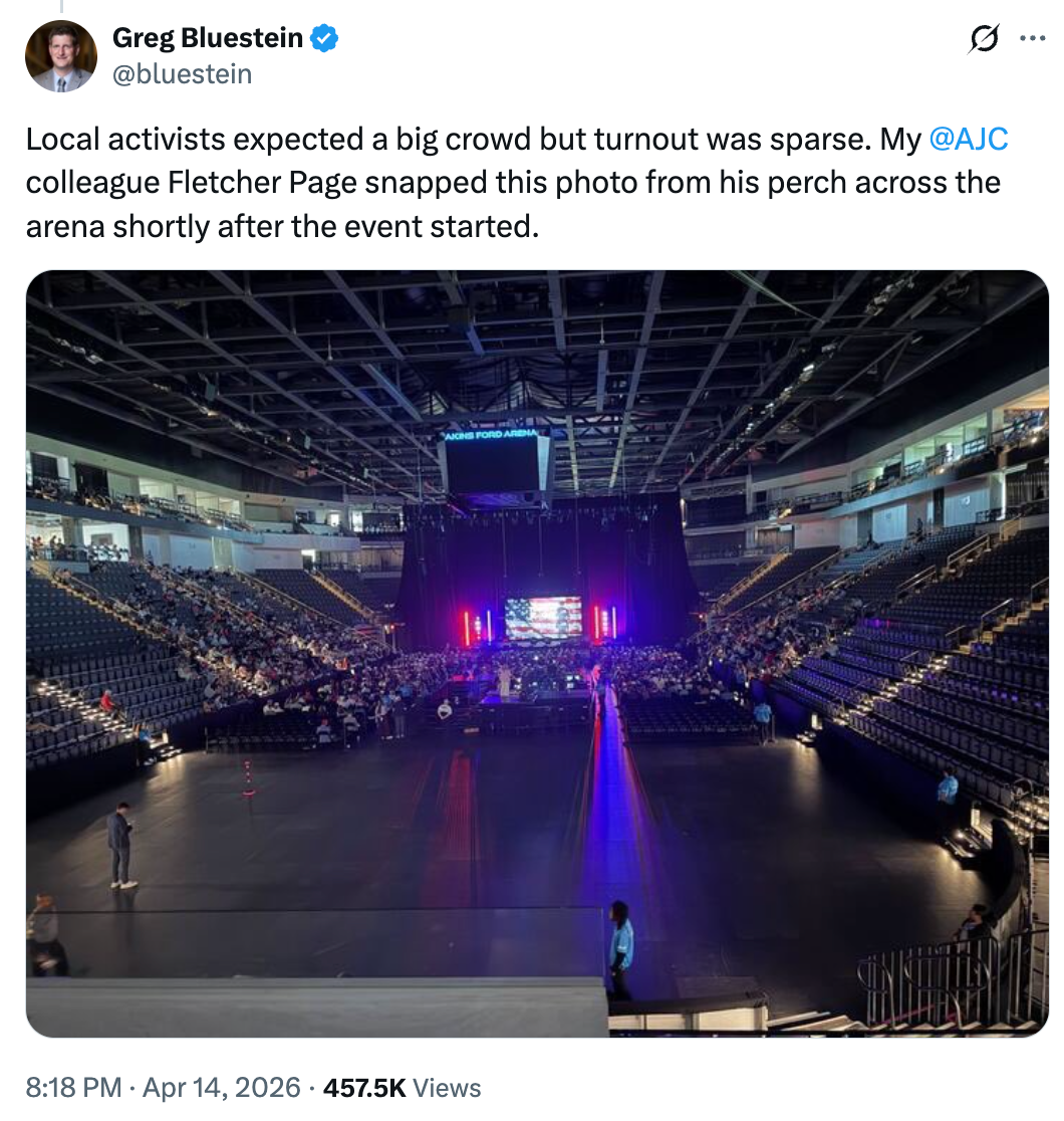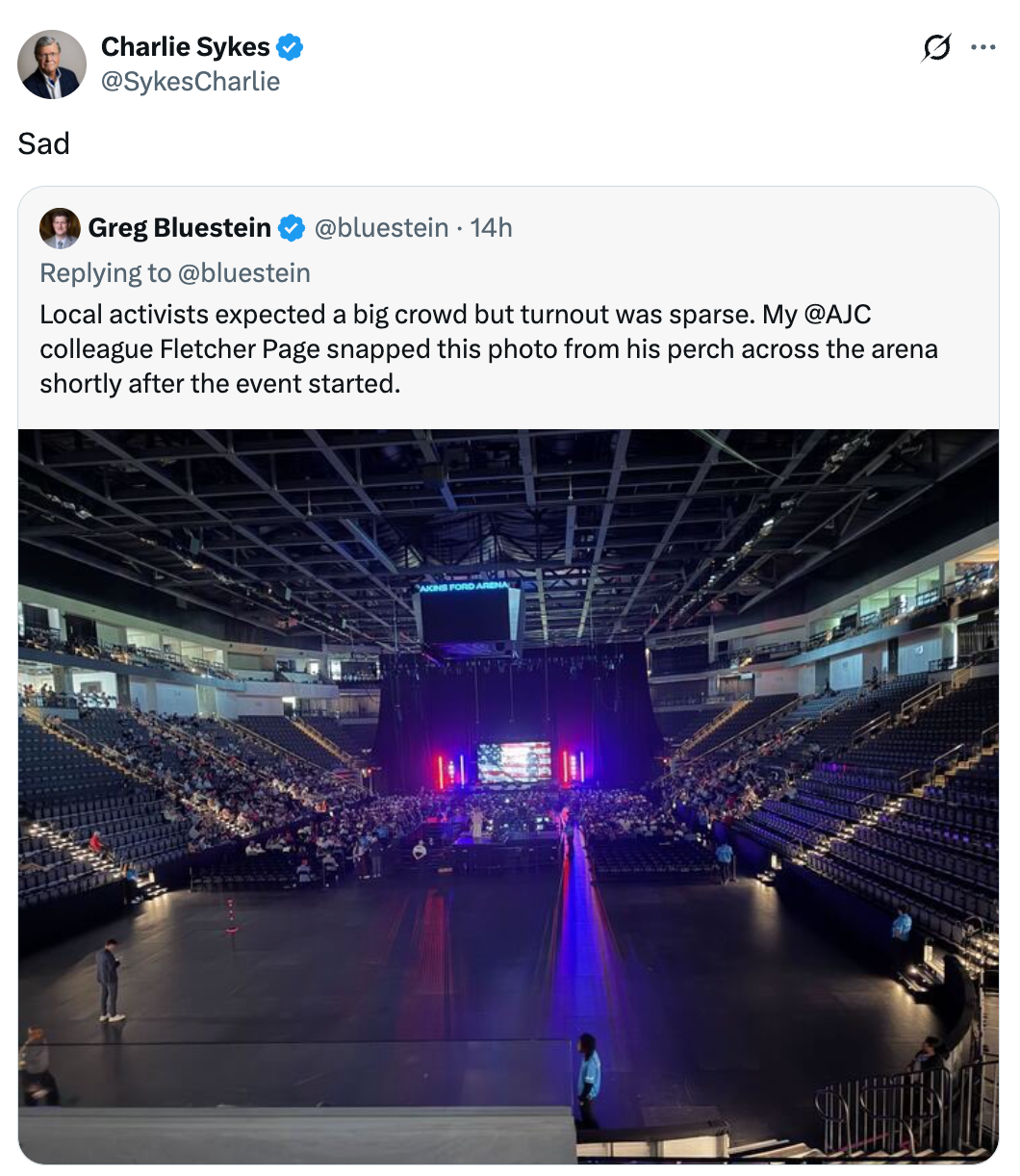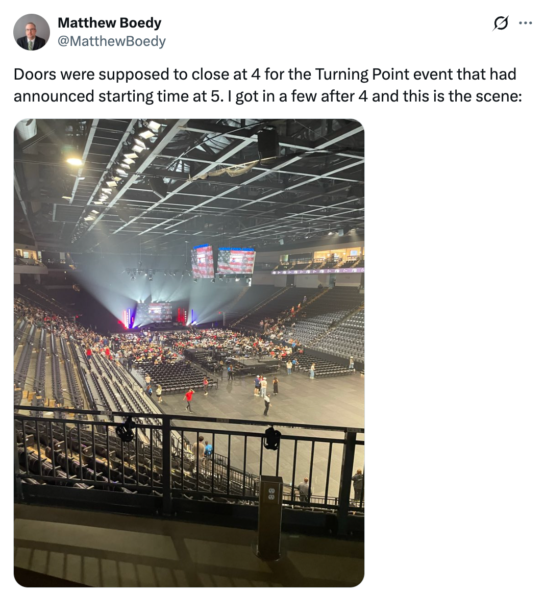 Turning Point USA seems to have misestimated crowd size for Vance. Akins Ford Arena less than 25% filled for the vice president. pic.twitter.com/K2SnkmuATh