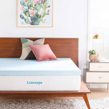 Promising review: "This saved me from buying a new mattress. After waking up daily with a backache (I'm only 30 and have no injuries or logical reason other than a bad mattress), I knew I needed to do something. This was a last-ditch effort to save myself from spending hundreds on a completely new mattress. So far, so good! It's a tad warm at times, yes, but I actually appreciate that because I tend to be cold when I'm falling asleep. At best, I have a comfy place to sleep. At worst, I throw off the extra blanket halfway through the night because I'm too hot. I'd recommend this to anyone but sleepers who already get too hot at night. If that's you, look into one with ventilation holes (this is one solid piece) and cooling properties." —Leandra