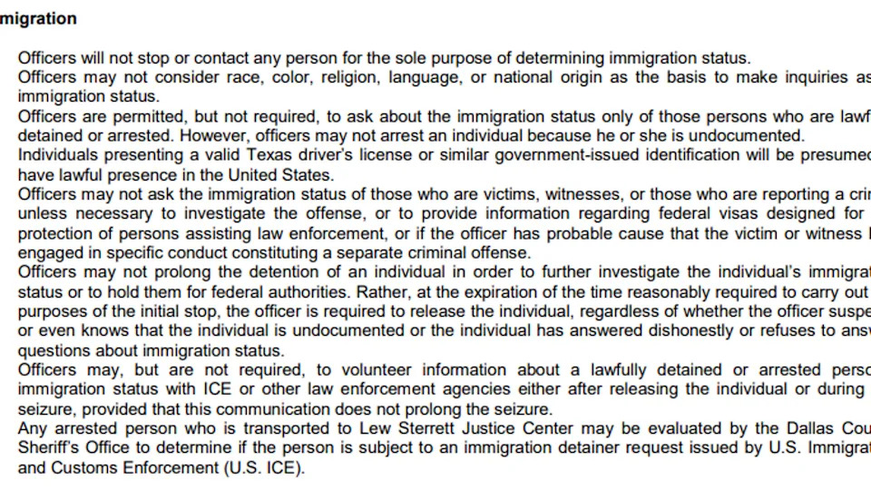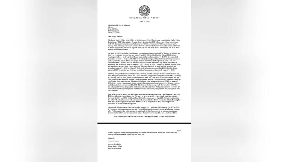 The Brief Gov. Abbott warns Dallas could lose nearly $90M over ICE policy disputes. He says a police policy conflicts with the city’s promise to cooperate with DHS. Dallas says it will comply with the law and respond by the April 23 deadline. DALLAS - Texas Gov. Greg Abbott says the City of Dallas stands to lose nearly $90 million in funding if it does not change their ICE cooperation policy. In response, the city says they intend to fully comply with all state and federal laws. Local perspective Abbott's letter, released Thursday, notes that the city did certify in April 2025 that it would "participate fully" in all DHS programs and procedures, including the increased efforts to detain and deport undocumented immigrants. However, the letter says, a following Dallas Police Department General Order contradicts that certification. The governor's letter points out General Order 315.04, which he says could cause Public Safety Office grants to be recalled, and future FIFA World Cup safety grants to be canceled. All told, the city could lose out on $87.2 million in state funding for public safety if the order is not repealed. What's next Abbott's letter gives Dallas until April 23 to confirm that the General Order will not be enforced and to promise that it will be repealed. If the deadline isn't reached, the letter says the grants could be forfeit. What they're saying "The City of Dallas is in receipt of Governor Abbott’s letter regarding public safety grant funding and cooperation with federal immigration authorities," a response from the city says. "We remain committed to complying with all applicable state and federal laws while continuing to prioritize public safety for the residents of Dallas, and ensuring our officers have the resources and support necessary to effectively serve the community. The City will respond in writing on or before April 23, 2026." Dig deeper The police order in question outlines DPD's operations in relation to immigration status operations. As a whole, the eight-point order boils down to treating suspects without discrimination, and outlines when an officer can inquire about documentation and how long a suspect can be held in custody when their immigration status is in question. The governor's letter appears to be directed at the final three points of the order. Point F says police cannot hold a suspect longer than is necessary for the initial stop, even to investigate documentation status. Point G says police can inform ICE about a suspect's immigration status as long as the seizure isn't prolonged. Point H says any arrested person taken to jail can be checked for an ICE detainer request. Big picture view Abbott's push for city leaders to enforce police compliance with federal immigration operations has been ongoing since DHS began ramping up their efforts under the Trump Administration. Major cities had their public safety funding put on the line if they did not promise total cooperation. Most recently, Houston was told they would lose $110 million in grants if they did not repeal a similar ordinance, which allowed HPD officers to release a suspect before ICE arrived in order to prevent illegally prolonging stops. Houston has since planned an April 22 special meeting of the city council to consider repealing the ordinance. The Source Information in this article comes from Gov. Greg Abbott, the City of Dallas and previous FOX Local coverage.