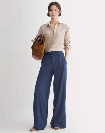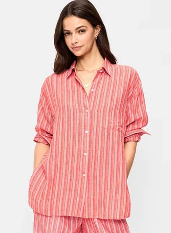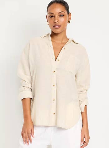 Promising review: "I live in these linen button-downs during the summer. They're light and breezy but provide some shade from the sun. They look cute, super casual, or dressed up for the office." —anonymous