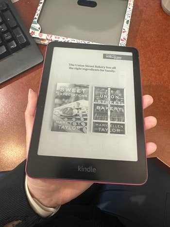 Promising review: "I'm a hardcore actual book (made of paper) lover, and set in my ways, but one of my favorite authors has begun publishing their books on Amazon, and you can't get them via libraries, etc., so I had to buy an e-reader. It takes some getting used to, and some cussing, but I do like it now. I do still prefer old-fashioned books, but I will admit that e-readers have several advantages. I was worried that the light would hurt my eyes and cause migraines, due to my extreme light sensitivity, but it doesn't. The light is adjustable and easy on the eyes (and head). The battery lasts forever. It holds SO MANY books. It's very lightweight. I have no complaints." —Tahnna