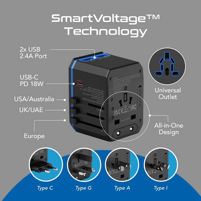 Once you're in Europe, it's actually quite easy to travel between different countries. So, if you decide you want to do a quick day trip to a neighboring country, just make sure you also have one of these handy universal adapters so you're never caught with a low battery somewhere. It's got different ports (including USB-A and USB-C) so you can charge more than one device at once! And it’s got built-in safety features like surge protection and plug locks.